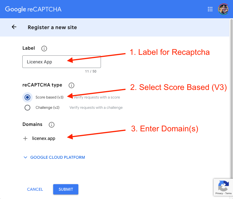 This will present you with the form you need to complete to setup a new set of keys for your reCaptcha installation. The form itself is pretty straight forward. You will need to add a “Label” which is what this Key/Pair will be known as. It’s usually good to make it reference the domain you are securing with reCaptcha.