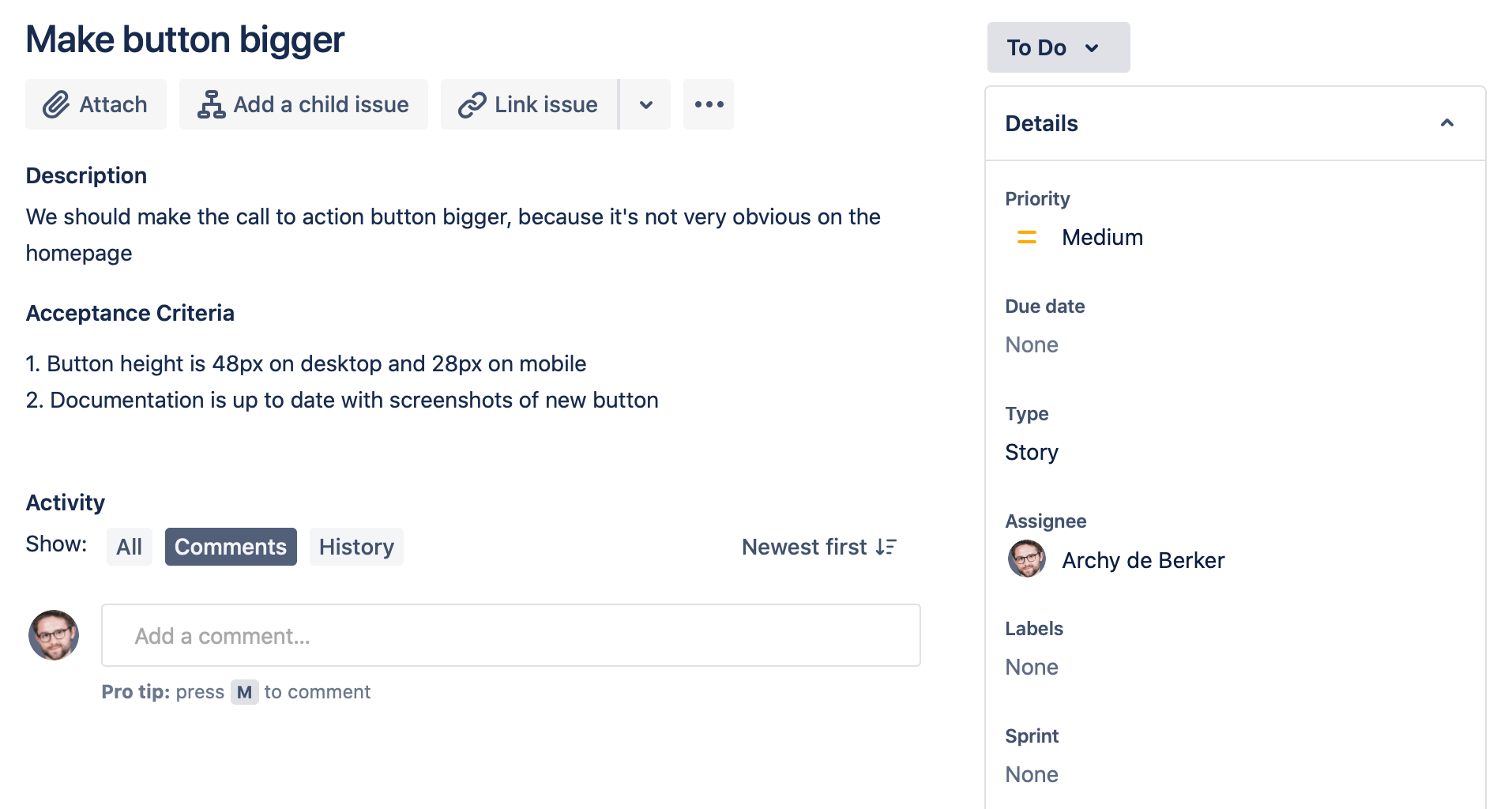 If you’re making a change to the way something looks, include a screenshot or even a video of how the thing has changed! We’re trying to make life easy for the reviewers. Don’t make them checkout your branch to see the effect that changing a margin by 10px has on a button!
