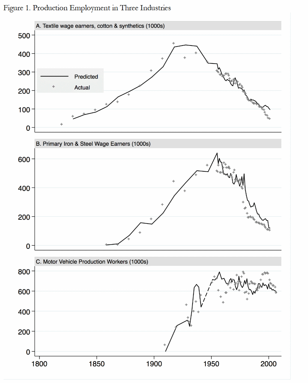 James Bessen in his paper for Economic Policy12 analyzes this effect across three industries: US textile, steel, and automotive. Over 150 years of technological progress, the number of textile workers earners and iron & steel workers first went up, and then came down. On the other hand, over the past hundred years or so, the number of automotive workers has gone up, and then stayed flat. See chart below.