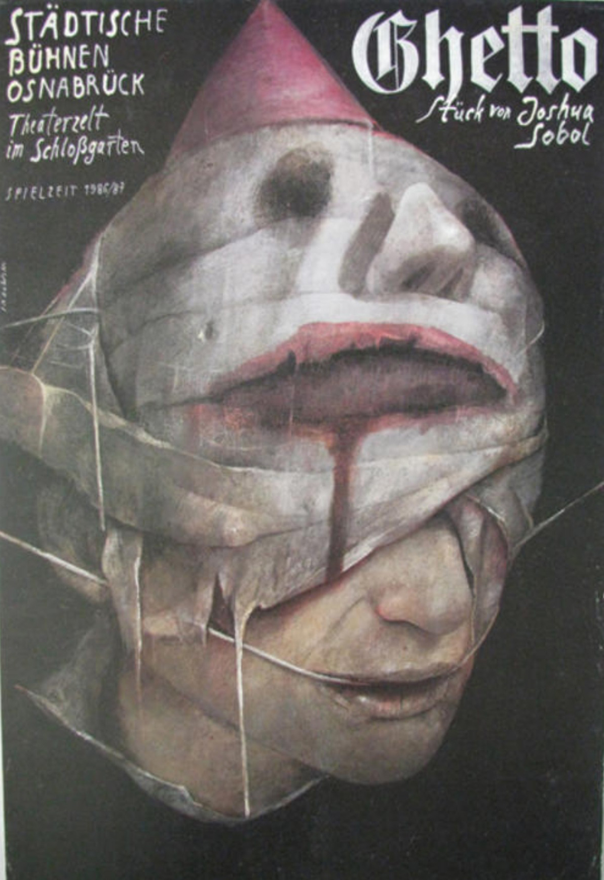 Continuing on, the poster Ghetto highlights a child wrapped in a bloody clown mask with smeared makeup and a red cone attached, held together by strings. Similar to his other posters, Sadowski used darker colors like blacks, reds, and grays to enhance the overall feeling of fear. The child’s lip expression hints that the child is in pain. Perhaps this reaction is caused by the tension of the white string that wraps around his mouth. The clown mask that covers the child’s upper half of his head implies this idea of vulnerability because he cannot see his surroundings. The black background creates the concept of the unknown, which becomes prevalent in Poland’s role during the Cold War as they were unsure of when the fight for their freedom would be over. Sadowski wanted to expand his works to connect with others to remind them that the war isn’t over yet and that these posters are warnings and signs to look for.