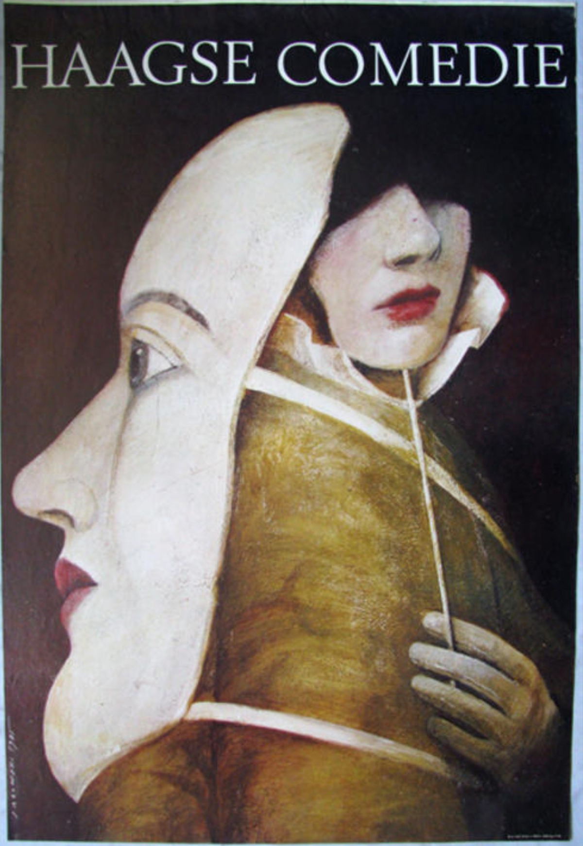 Just like the other designers, Wiktor Sadowski had a distinct style and interpreted powerful messages within his posters. When he was younger, he sought to create art that was monumental and significant to the art world. What inspired him to dive into poster design was the Warsaw kiosks in Poland, which were the only way to view art. The kiosks brought hope and motivation for the Polish during their darkest hours as it brightened the city with color. Sadowski pushed himself as an artist, and soon enough, his hard work led to his success. When comparing his five artworks shown in this exhibition, there is a common dark theme that could be reflected in the emotions the artist felt during the war. Small details such as the etched marks and deep shadows enhance the mood of his posters. Sadowski also included areas of intense color within his characters to create contrast for the plain background. This becomes visually impacting as a whole. For example, in the poster, Haagse Comedie, the yellow of the figure’s costume and the reds on both masks are bright areas of color, whereas the black background creates visual interest and drama for viewers. Overall, Sadowski’s creative output allowed him to produce unpredictable and fresh artwork that was pushed to its fullest potential.
