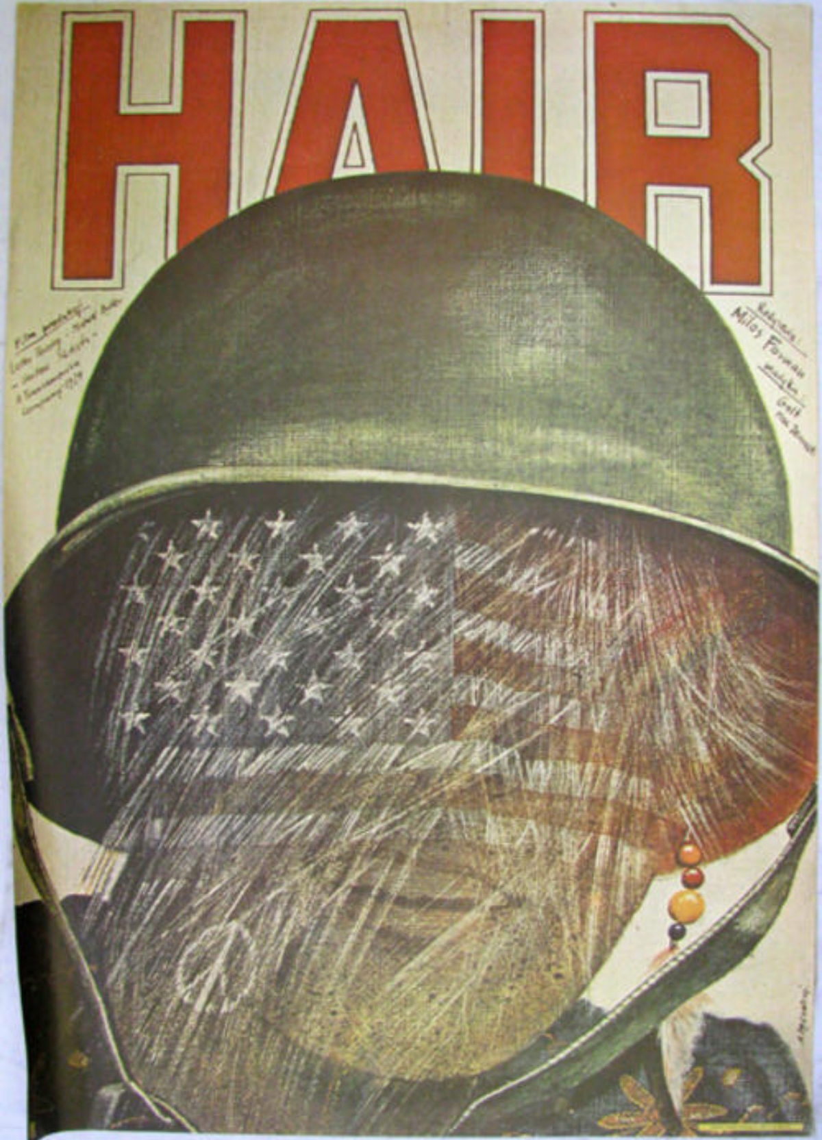 **Polish designer, Andrzej Pagowski, worked with symbolism in representing an in-depth meaning for viewers to identify. With that, symbolism revolves around common culture iconography. Influenced by events the Polish either celebrated or knew about, those who have seen the specific image could understand what it could represent. Essentially, cultural symbols are present in Pagowski’s works. In Hair, the poster displays a profile of a young American soldier with his face covered by hair and objects that symbolize freedom such as a reflecting American flag, a rainbow, and a white peace sign. This “mask” could symbolize the freedom that the soldier seeks. From Poland’s perspective, this imagery of achieving independence is what they’ve longed for. They might have seen how America was a significant symbol for freedom which is perhaps why Pagowski included these objects in response to Poland’s desire.