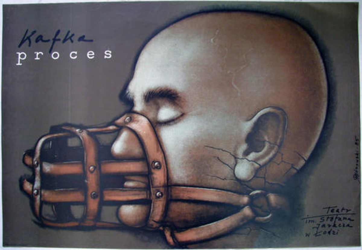 The next poster is for the Polish version of Franz Kafka’s novel Proces originally titled The Trial. Looking closer, the poster displays the profile of a bald man with thick bushy eyebrows and his eyes closed. His head casts a dark shadow on the gray background which highlights the man’s presence in the poster. Unlike other artists who use literal mask imagery, Gorowski created one through a red dog muzzle. This imagery of the dog muzzle creates a metaphor with ironic intent. Since the muzzle doesn’t fit the man, the artist could’ve made him speaking, but the idea that this tool is for animals, it’s clear that this man is treated like one, thus his inability to speak. This is like the treatment of the Polish during their oppression during the Cold War and WWII as they were “animals” that couldn’t be tamed.