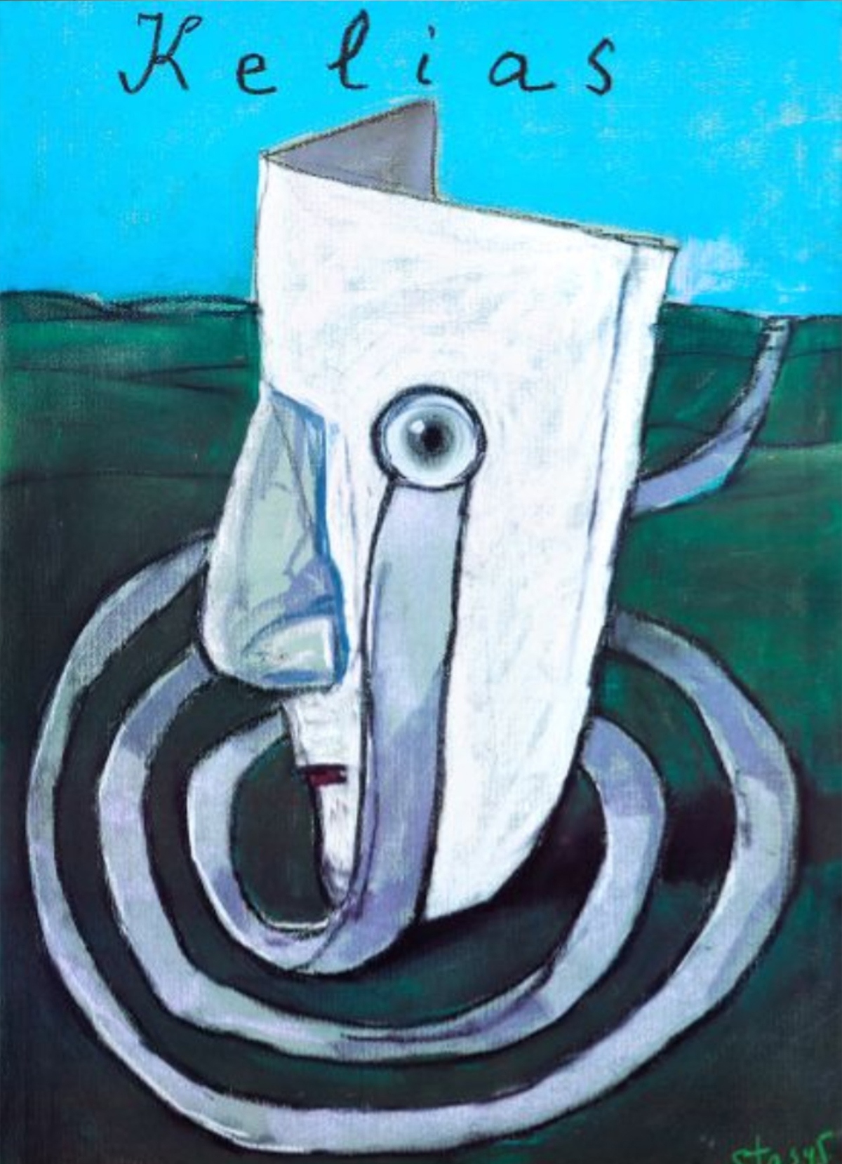 Similar to Samobojca (Suicide), this poster has photographed hands holding a mask with distorted facial features, though this time, the mask is blue. Two white birds overlay the head, intersecting and holding each other’s bent paper-like wings. - 5. Stasys Eidrigevičius, Kelias (Path), 20th century This poster displays a white mask with facial features resting on a green landscape, including a bright blue sky in the background. Perhaps the strip of the spiraling tear could either classify as a road traveling back to the green hillside or as a road coming from the hillside.
