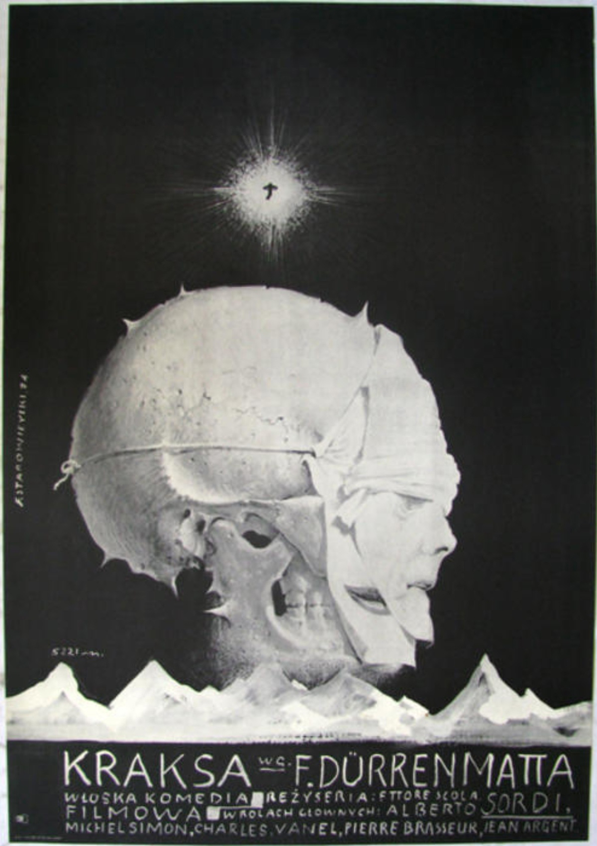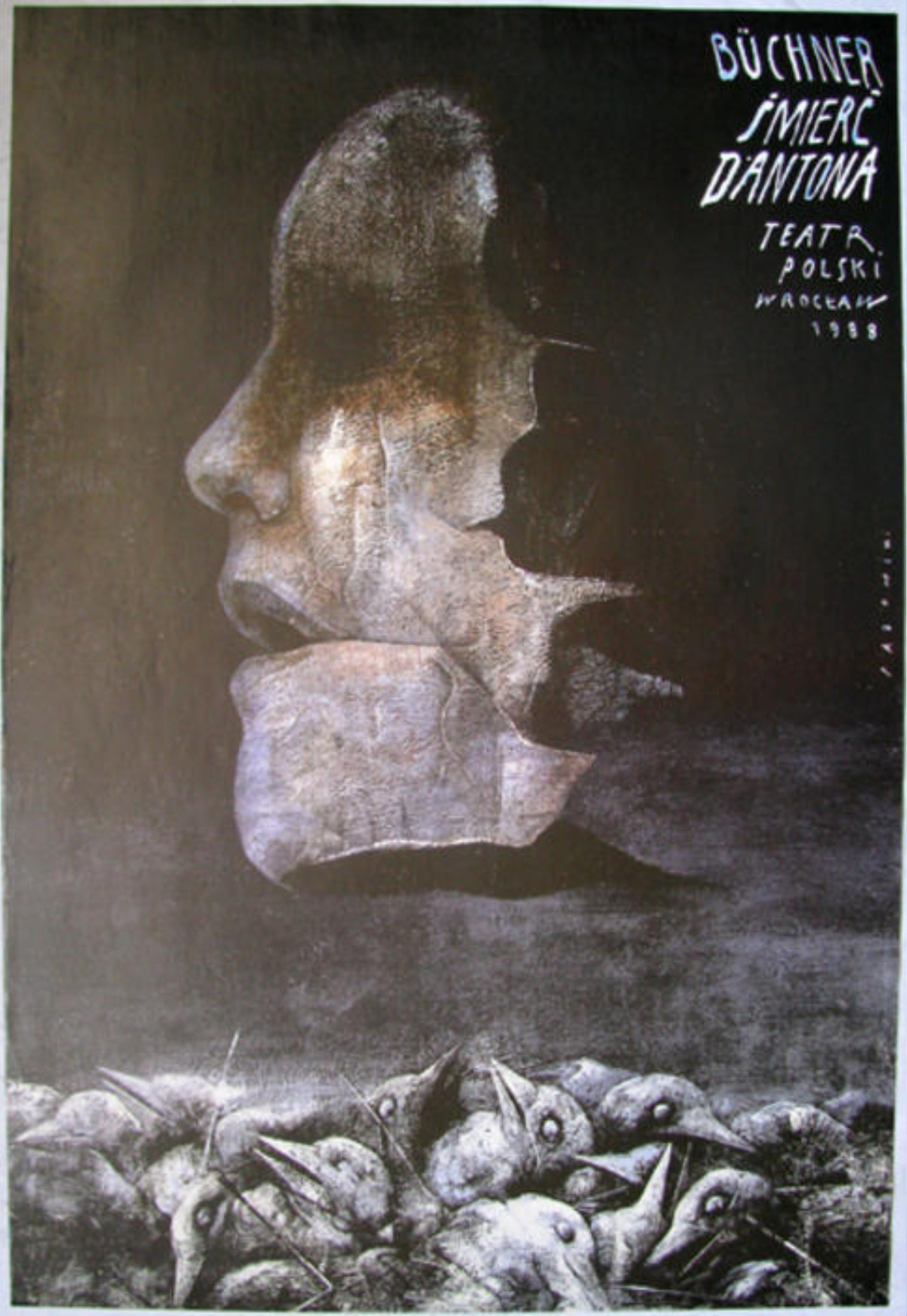 ***In terms of poster creation, Sadowski mostly used metaphors as a tool in his works. This was a way for his art to become expressive, as it allowed him to develop concepts such as fear and death. Beyond the image, viewers could engage and find a deeper meaning within his art. Beginning with Smierc Dantona (Danton’s Death), this poster features the profile of a mask-like face with hollowed eyes and an opened mouth hovering over a pile of dead crows. The tears around the edges of the mask suggest that it has been ripped out from something or someone. Because crows are symbols of death, the mask hovering over the pile of the birds could resemble that death is approaching. There is something sinister about the ambience created in this piece.