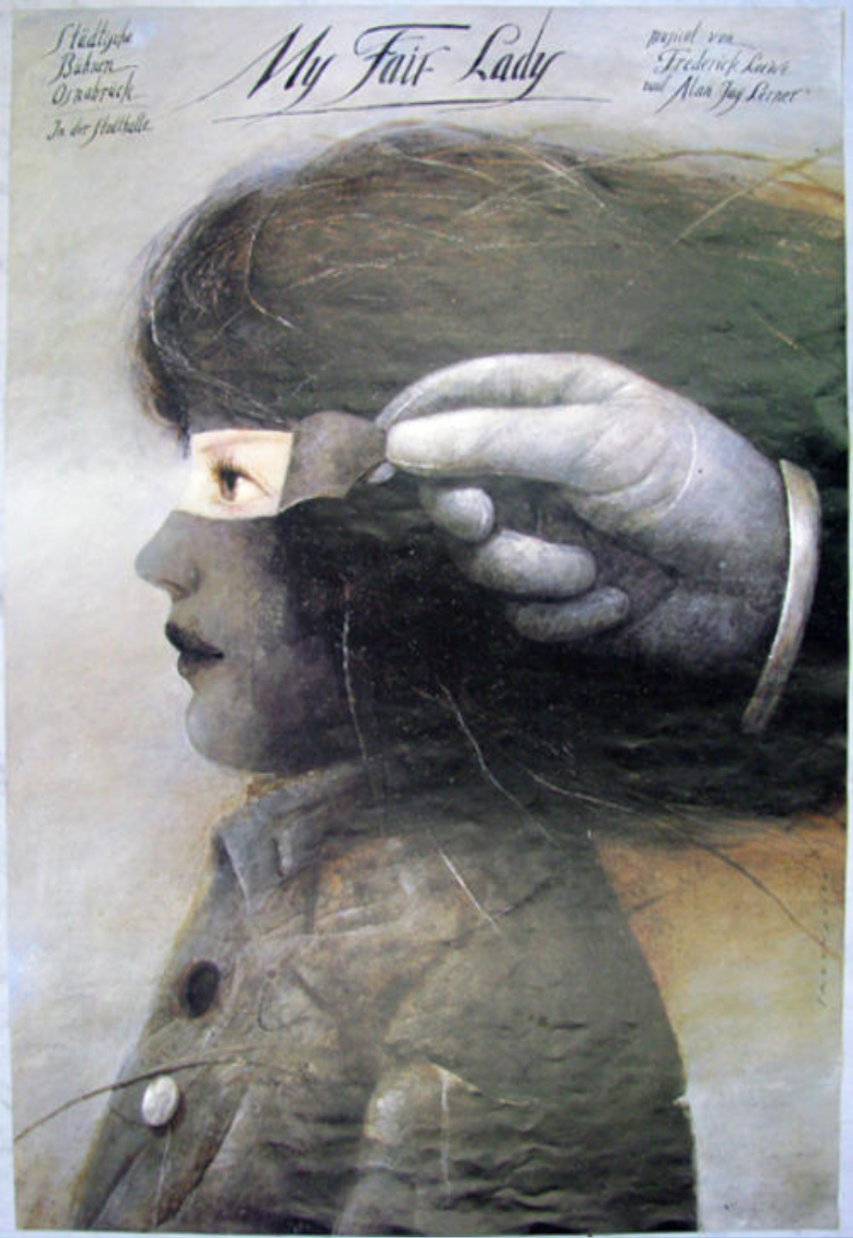 This poster displays two piercing drawn eyes, and in between, is a tear on the white background, which reveals a person’s face. The white negative space shields the remains of the person's face, which makes the viewers wonder what hides behind his white “curtain.” - 10. Wiktor Sadowski, My Fair Lady, 1986