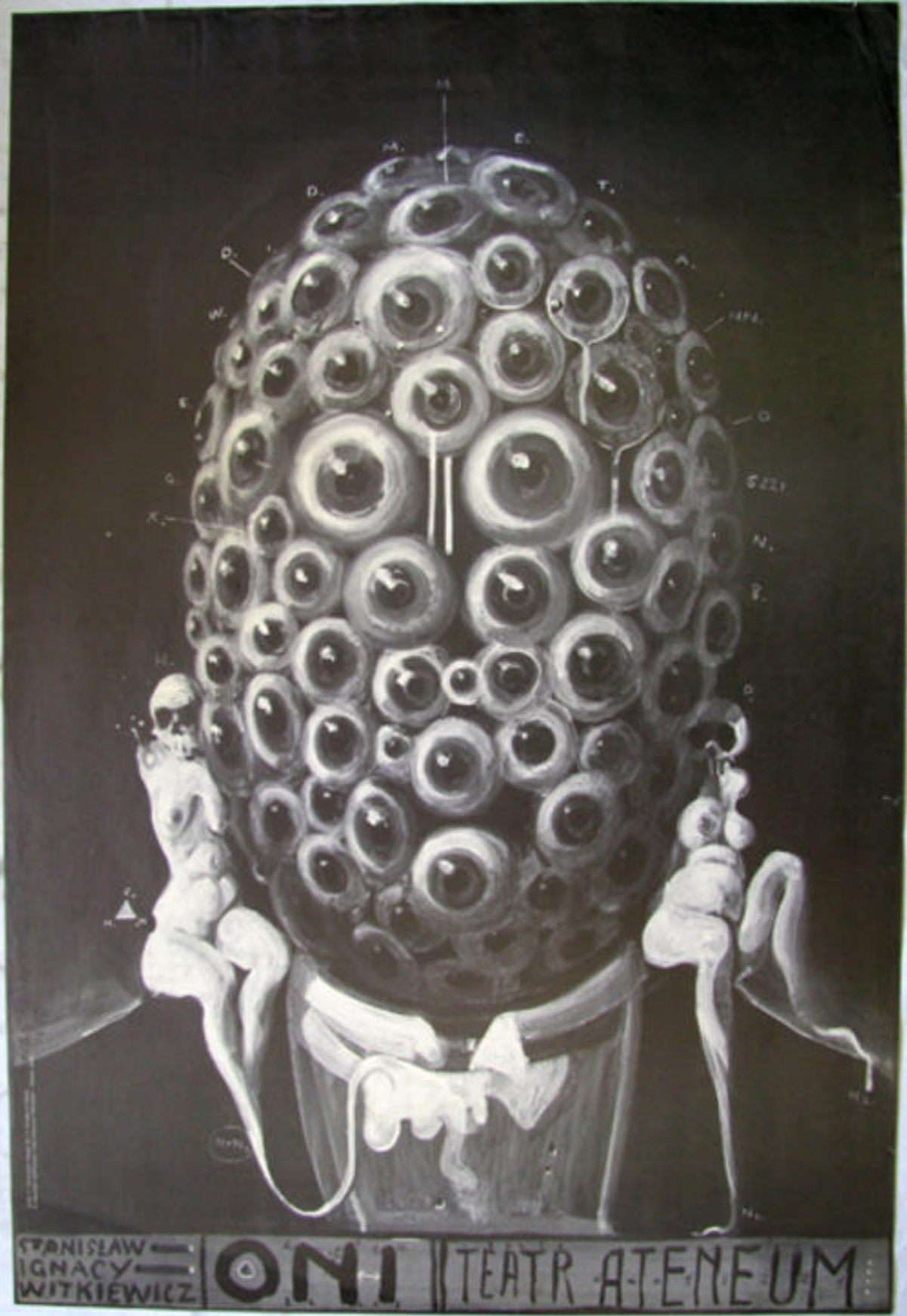 This poster displays a headless child wearing a colorful argyle sweater who is holding a string with attached objects that resemble facial features like a silver crescent shape for an eyebrow, a red sphere for a nose, and an orange bead to resemble a mole. The artist, Wieslaw Walkuski, experimented with these random symbols, graphics, and colors to create a playful, yet unique poster. - 8. Franciszek Starowieyski, Zdziczenie Obyczajow Posmiertnych (Savagery of Posthumous Habits), 1983