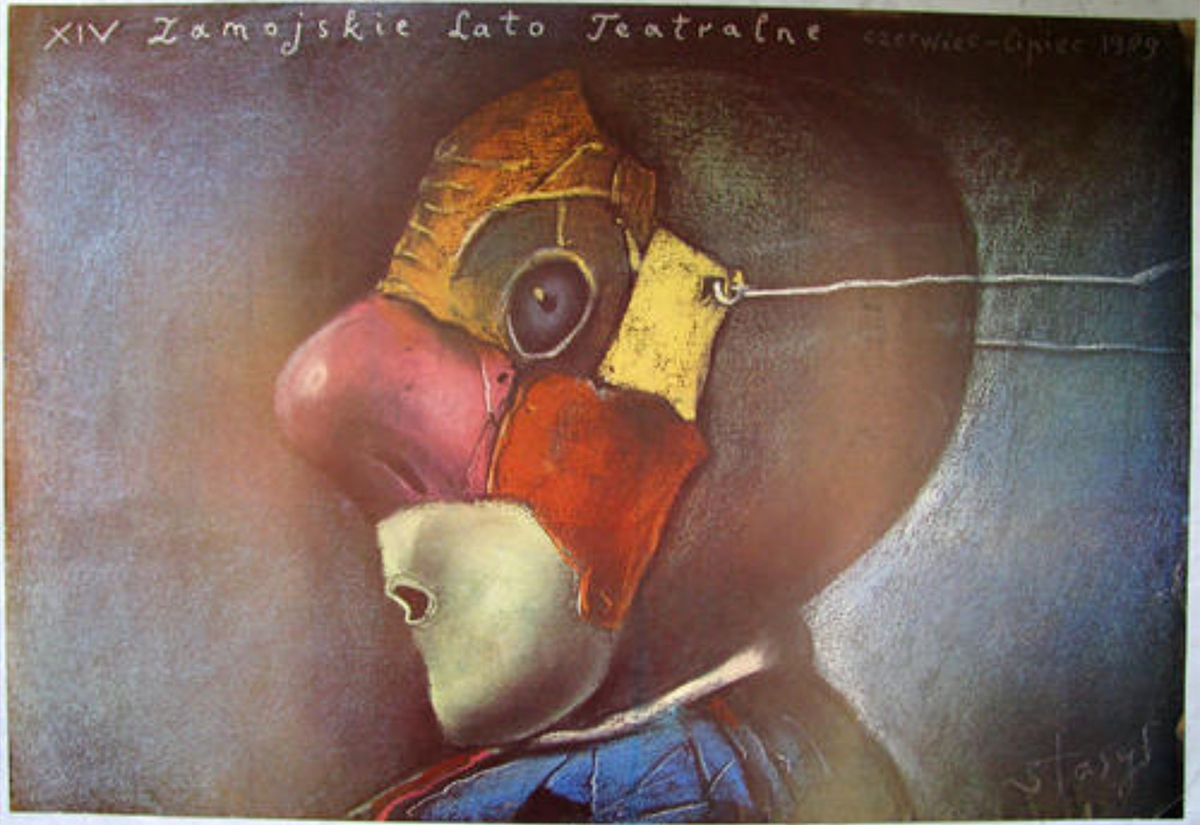 Perhaps the only artist that used mask imagery in all of his works is Stasys Eidrigevičius. His work reflected the effects of “growing up in a society in which for two generations people had to hide their true selves in order to survive” (The World of Stasys Eidrigevičius). Furthermore, the Lithuanian artist took an interest in the symbolism of masks as a tool to push for change. From there, masks became important in Stasys’ work. He believed that “a mask is like a new face,” meaning that it was a way to reveal the true identity or emotion of a person. When observing his works, they all contain a similar distinct and timeless character he designed. Identifying his style is very obvious among other artists. His interest in masks could have started from when he saw Native American masks in Chicago, Illinois, in 1986. Comparing his style to the Native American masks, they both used distortion and exaggeration of facial features to either emphasize their beauty or highlight their emotion. However, Stasys took a different approach to his creation of enigmatic masks. Instead, he took a darker turn in design where most of his characters' eyes seem cold and lifeless and their facial expressions were never smiling. This could insinuate the sense of loneliness he and others felt during the war. Since then, he has made a series of mask designs. Later on, his work reached popularity among the public and the Polish posters. Each of his unique mask designs reflected on the life of Poland crushed by authoritative dictatorships.