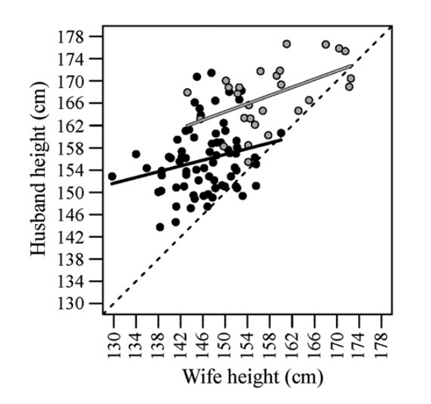 The Duolicious matching algorithm works by finding people similar to you. While a lot of people say, "opposites attract," sociologists have actually found that people tend to date others who are more similar to each other than not. Scientists call that "assortative mating." Surprisingly, even for traits like height, where there's typically a big difference between each partner in a relationship, there's still a correlation between both partners' heights! Here's a chart from a study of two groups of married couples in Cameroon, but assortative mating happens everywhere, even in other species:
