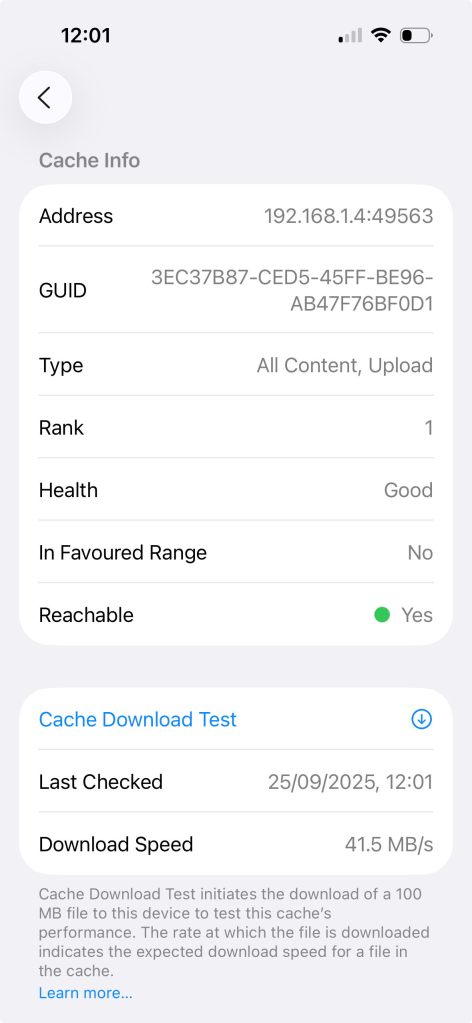 Then, out of the blue, iOS and iPadOS 26 introduced a new feature to identify and test a connected caching server.