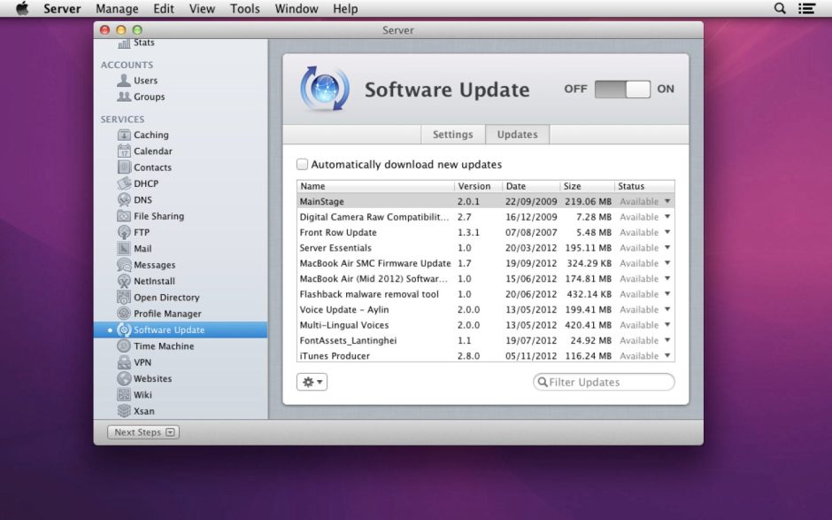 This shows the Software Update service in OS X Server 2 in 2012, with a list of some of the updates it had in its cache at the time.