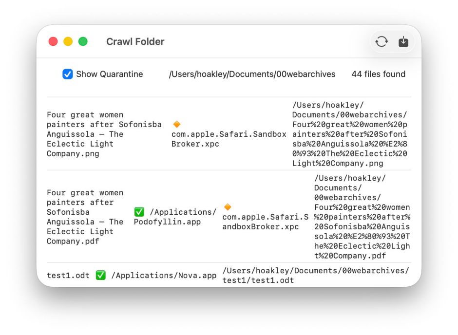 You’ll then see the file name, any Provenance ID converted to the path of the editor app and a green tick emoji, then a gold diamond and the responsible app given in the Quarantine xattr, followed by the full path to the file. You can copy and paste lines from this, or export the full results to a CSV file.