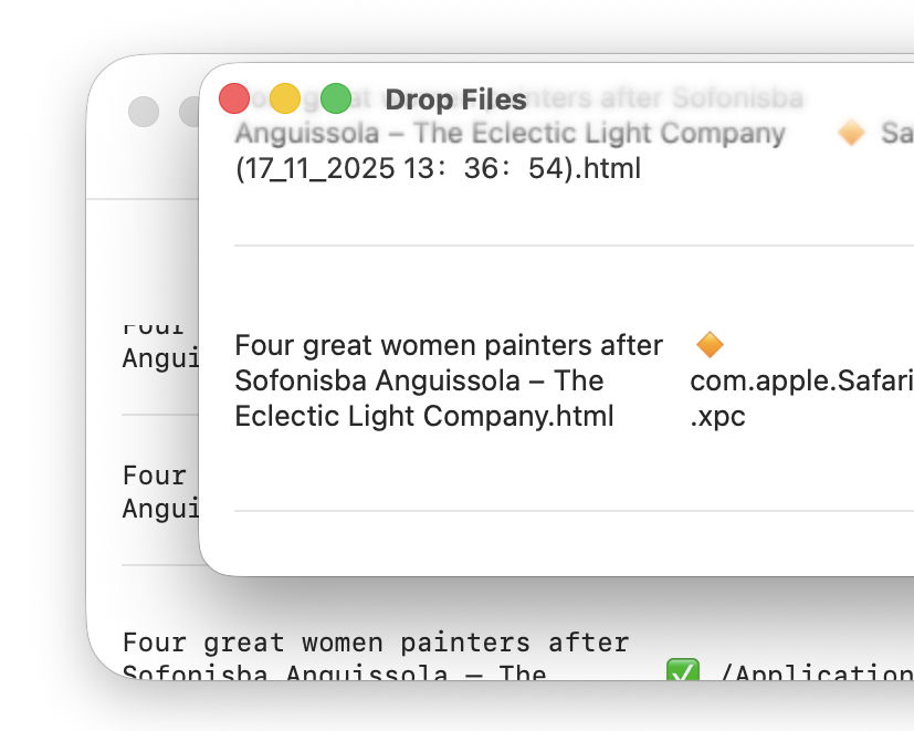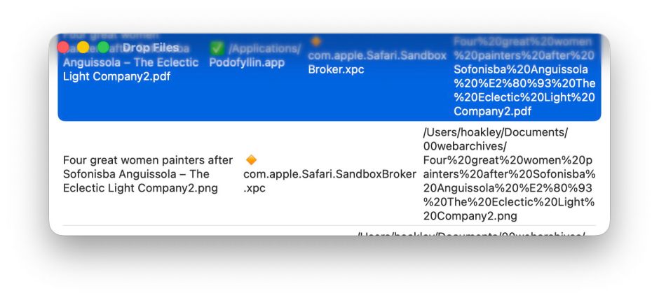 With the window in focus, the selection colour overwhelms the traffic light controls and window title, which should read Drop Files. This also draws attention to the limited width necessary to accommodate rectangular content in a window with excessively rounded corners.