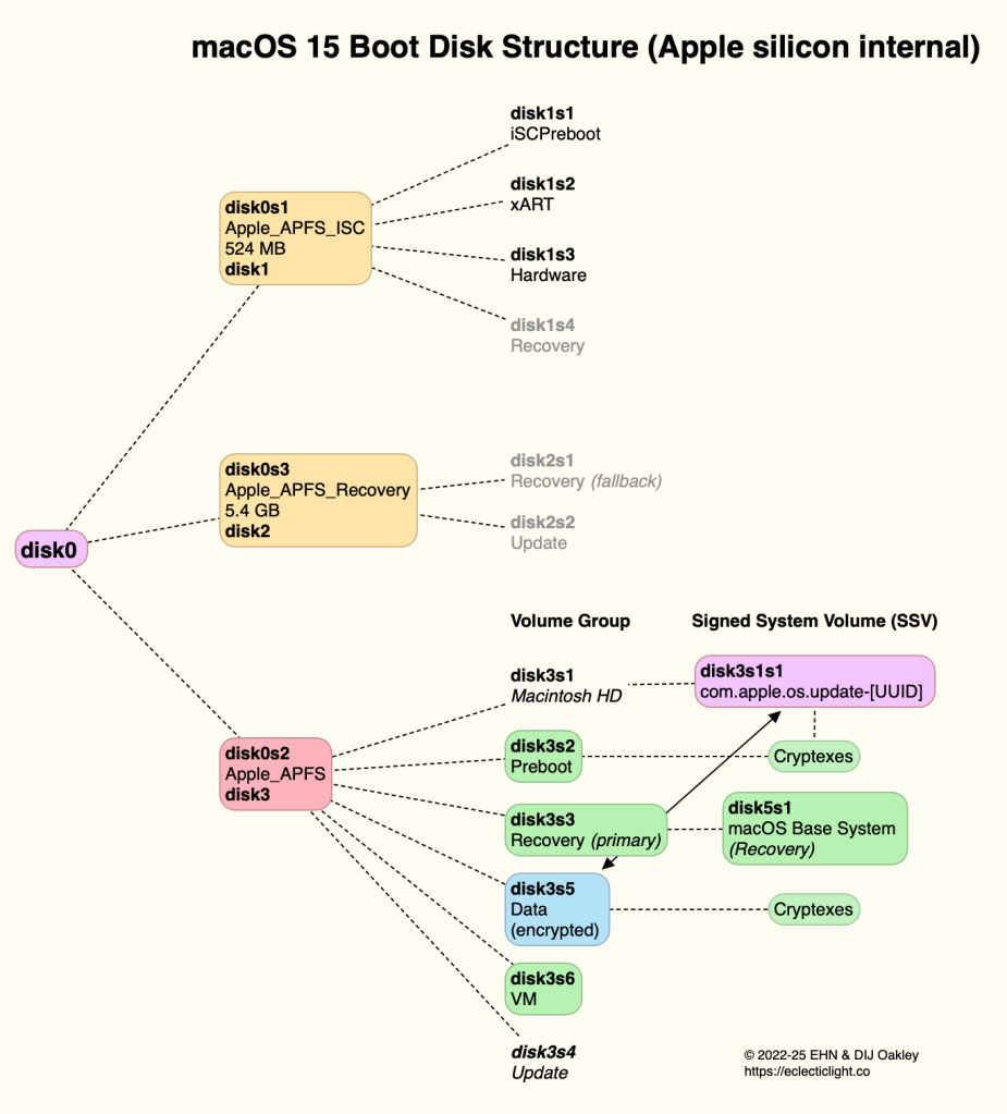 - iBoot or iBoot Stage 2, popularly but incorrectly called the ‘firmware’, has to verify a set of hashes used to guarantee the integrity of key information, by comparing a stored copy of the hash against a hash of that hash, termed its signature. Among those is the root hash of the Signed System Volume (SSV), but iBoot doesn’t attempt to access the SSV or its hashes, merely passing on the verified root hash for the kernel to use later. Once it has completed those checks, iBoot verifies, loads and runs the macOS kernel.