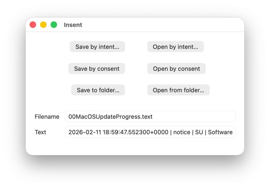 - Open by consent, which results in Insent choosing a random text file from the top level of your Documents folder, and displaying its name and the start of its contents below. As it does this without involving the user in the process, the macOS privacy system TCC requires it to obtain the user’s consent to list and access the contents of that protected folder.