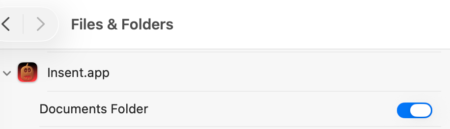 - Open Privacy & Security settings, select Files & Folders, and confirm that Insent has been given access to Documents.
