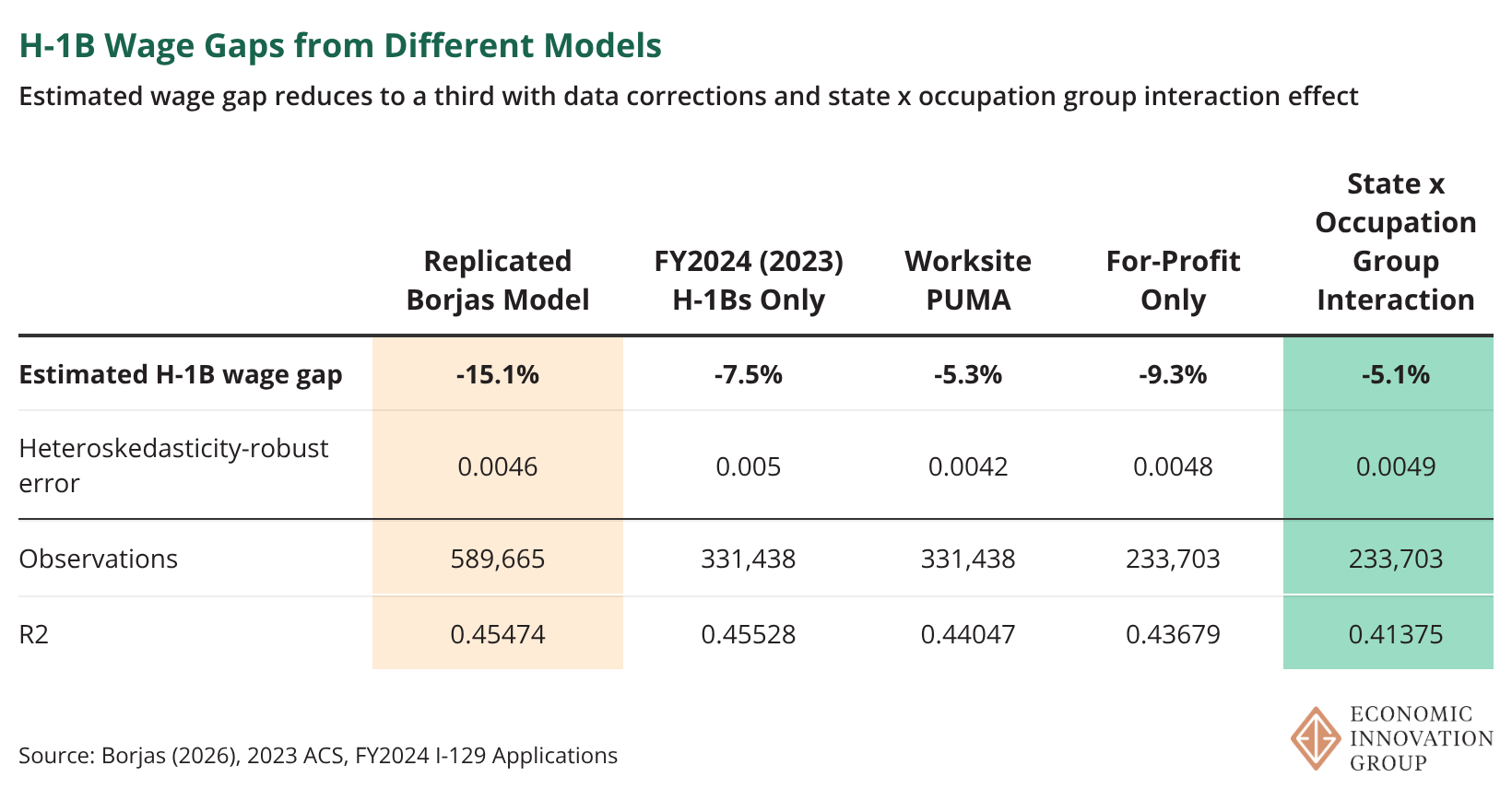 Using worksite state-POWPUMA combinations as geographic fixed effects, combined with restricting the sample to only 2023 data, further reduces the H-1B wage gap to just 5.3 percent — about a third of what Borjas found, without altering model specifications.