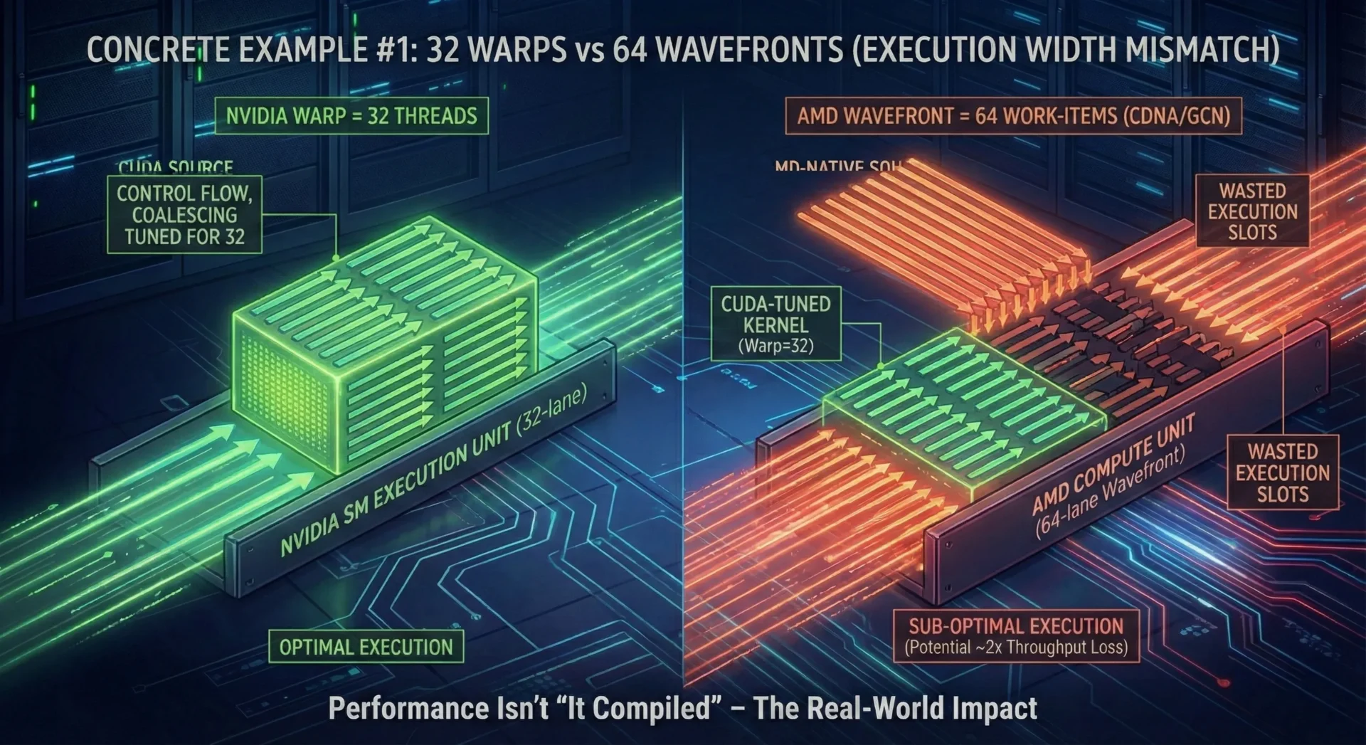 If a kernel’s control flow, synchronization, or memory coalescing is implicitly tuned for warp32, running it unchanged on wave64 can strand lanes or force the compiler/runtime to add masking/shuffles, often cutting effective throughput. In other words: the “same” kernel can be ~2× off the peak simply from the execution width mismatch, before we even talk about cache behavior or matrix-math usage. AMD dev material underscores how wave64 has different resource/occupancy characteristics than wave32. gpuopen.com