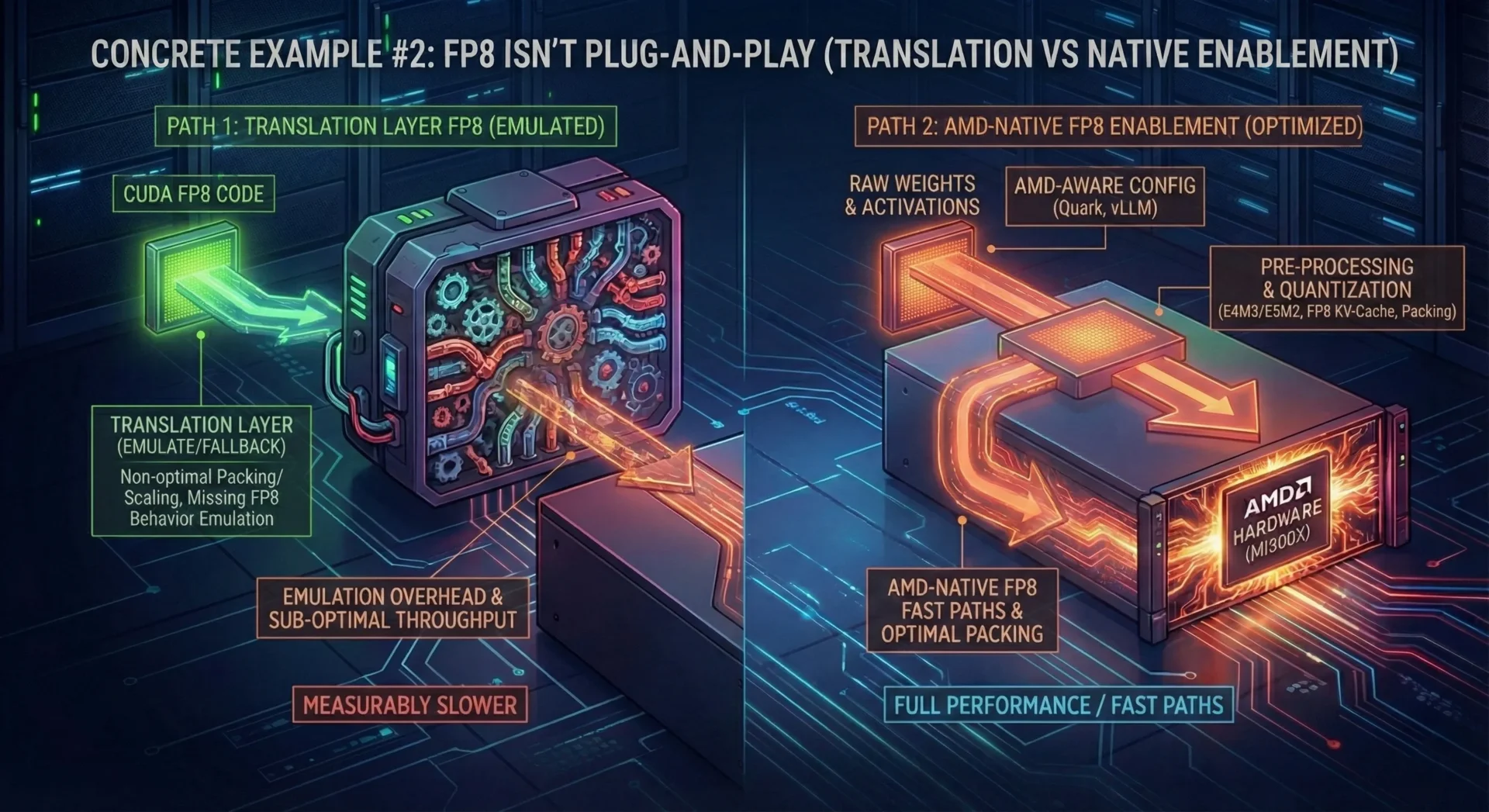 If a translation stack has to emulate missing FP8 behavior or falls back to non-optimal packing/scaling, the “portable” path quickly becomes measurably slower than AMD-native FP8 enablement.