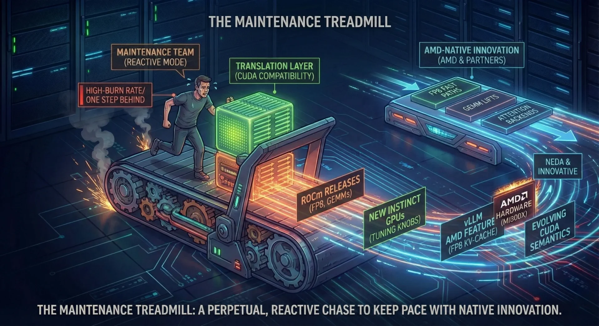 To keep pace with AMD-native tooling, a “CUDA-everywhere” layer must constantly: