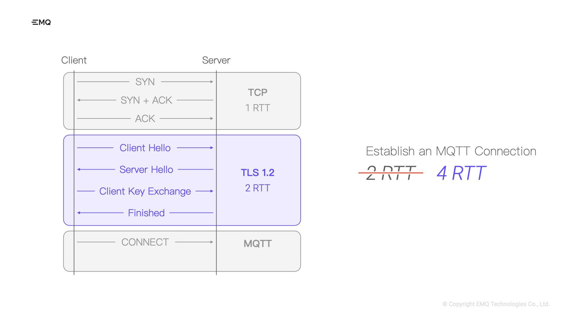 For example, with TLS 1.2, the client and server need to perform an additional four handshakes. Therefore, adding the TCP and MQTT handshakes, we need a total of eight handshakes to establish a connection, meaning we need to wait for four RTTs. If our current network latency is 50ms, establishing a connection would require 400 milliseconds.