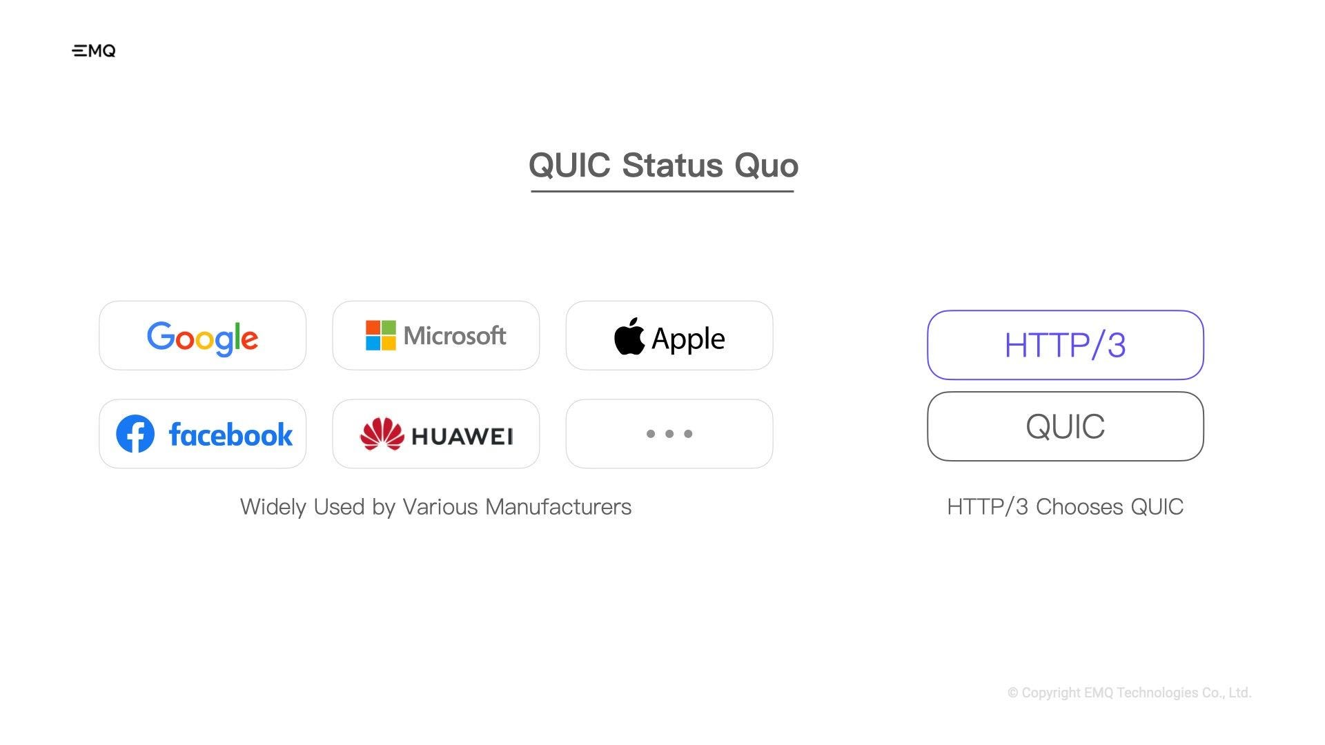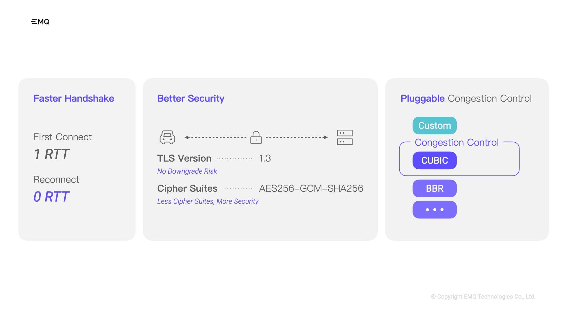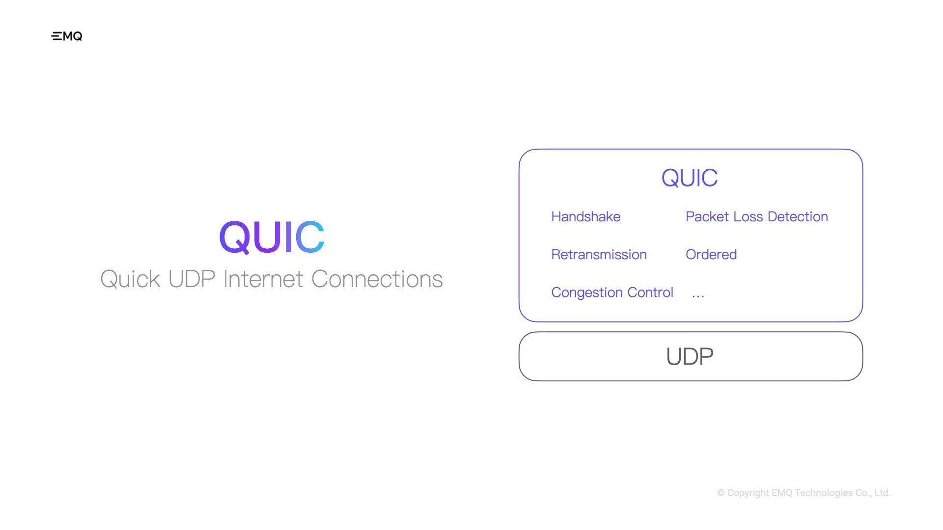 To address these challenges, EMQ embraced the QUIC protocol—an initiative of Google launched back in 2013. The full name is QUICK UDP Internet Connections, and as the name suggests, QUIC is built on top of UDP.