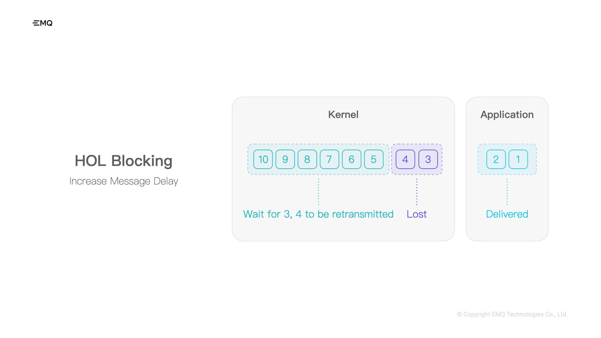 Also, packet loss is random when packets go through the network. So it can happen that we send 10 packets but lose the 3rd and 4th packets. The first two packets can be immediately placed into the receive buffer waiting for the upper-level application to read them after they reach the receiving end. But for packets like 5, 6, 7, and 8, even though they are already reached the receiver, due to the third and fourth packets being lost, these packets must wait for the sender to retransmit the missing packets to maintain the correct order for the upper layer. Only after the two retransmitted packets arrive can these packets be delivered together. This undoubtedly increases the delay of these packets that arrive first.