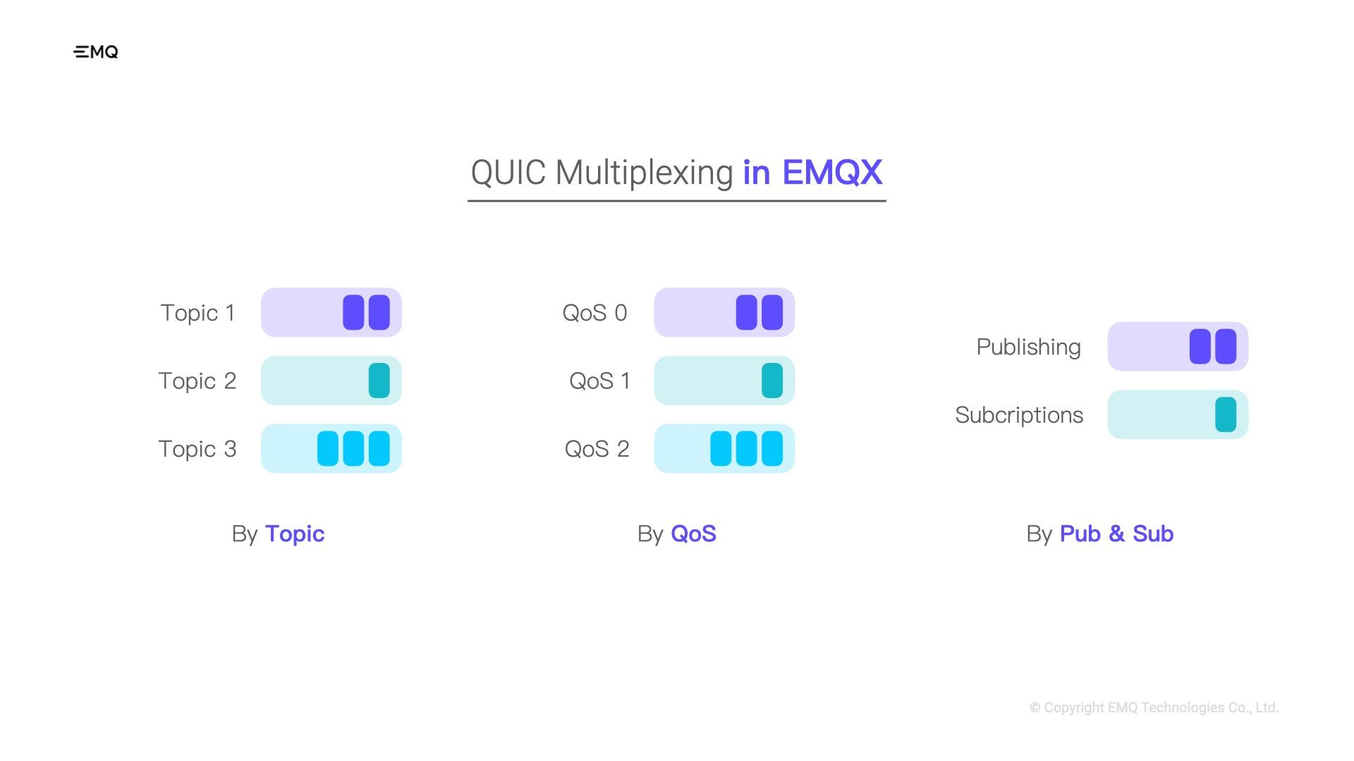 Let's take multiplexing as an example, one of the most valuable features of QUIC. Here's how it works: the client can establish separate streams for each topic, ensuring that messages from different topics do not hinder each other. If the importance of our message is more closely related to the QoS levels, for example, we don't want QoS 0 messages to block QoS 1 or QoS 2 messages, we can create individual streams for each QoS level. Additionally, for MQTT QoS 1 and QoS 2 messages accompanied by acknowledgments, we can split the sending and receiving messages into distinct streams, preventing those acknowledgments from being obstructed by other application messages.