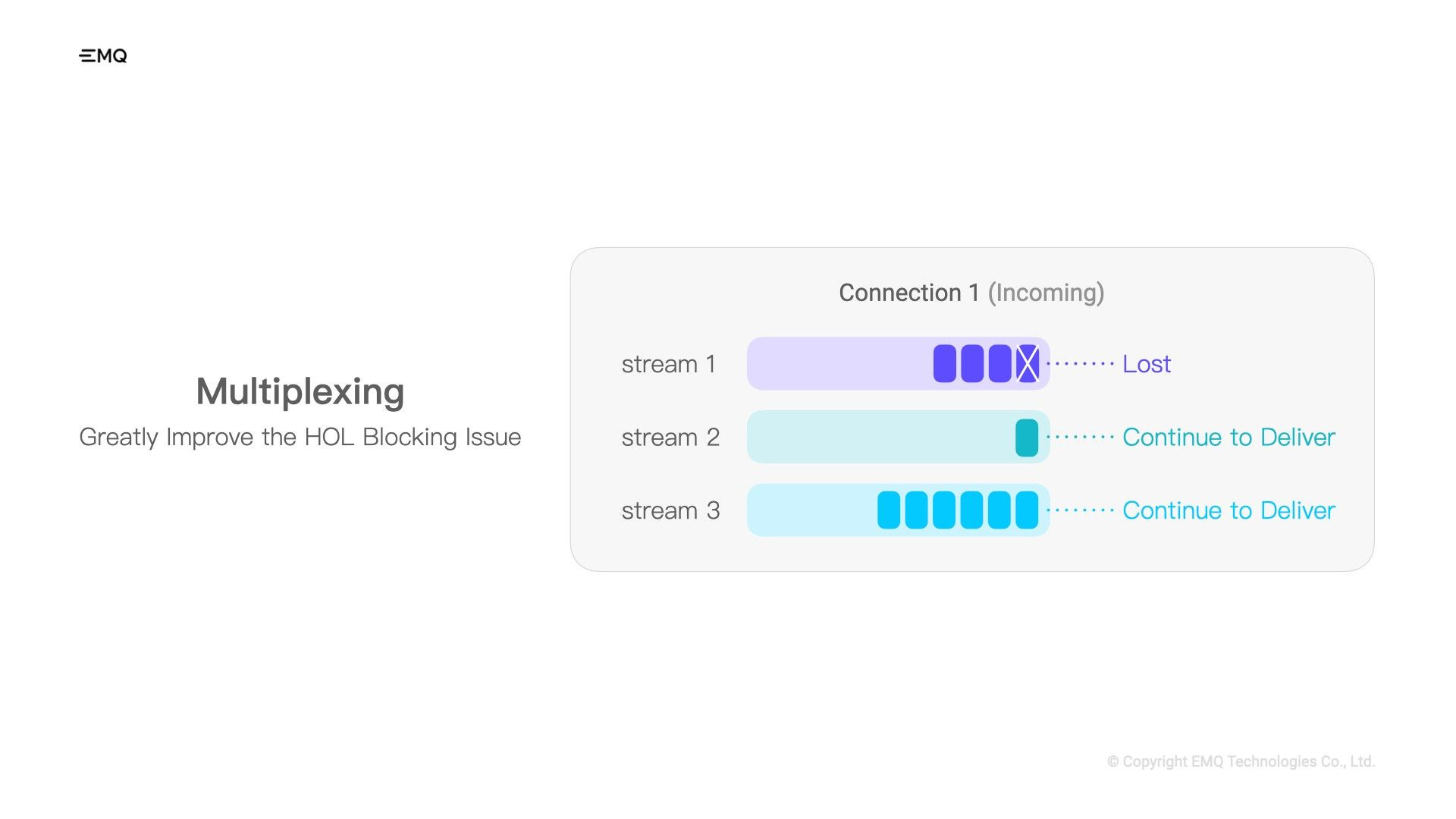 Imagine you have a device that reports data. Sometimes it tells you how much battery it has left, and sometimes it warns you about something urgent. These messages are not related to each other, and they don’t have to be in order. But constrained by the TCP HOL blocking, if a normal message gets lost, our urgent event notifications may be blocked due to the loss of regular status messages, and cannot be delivered northward.