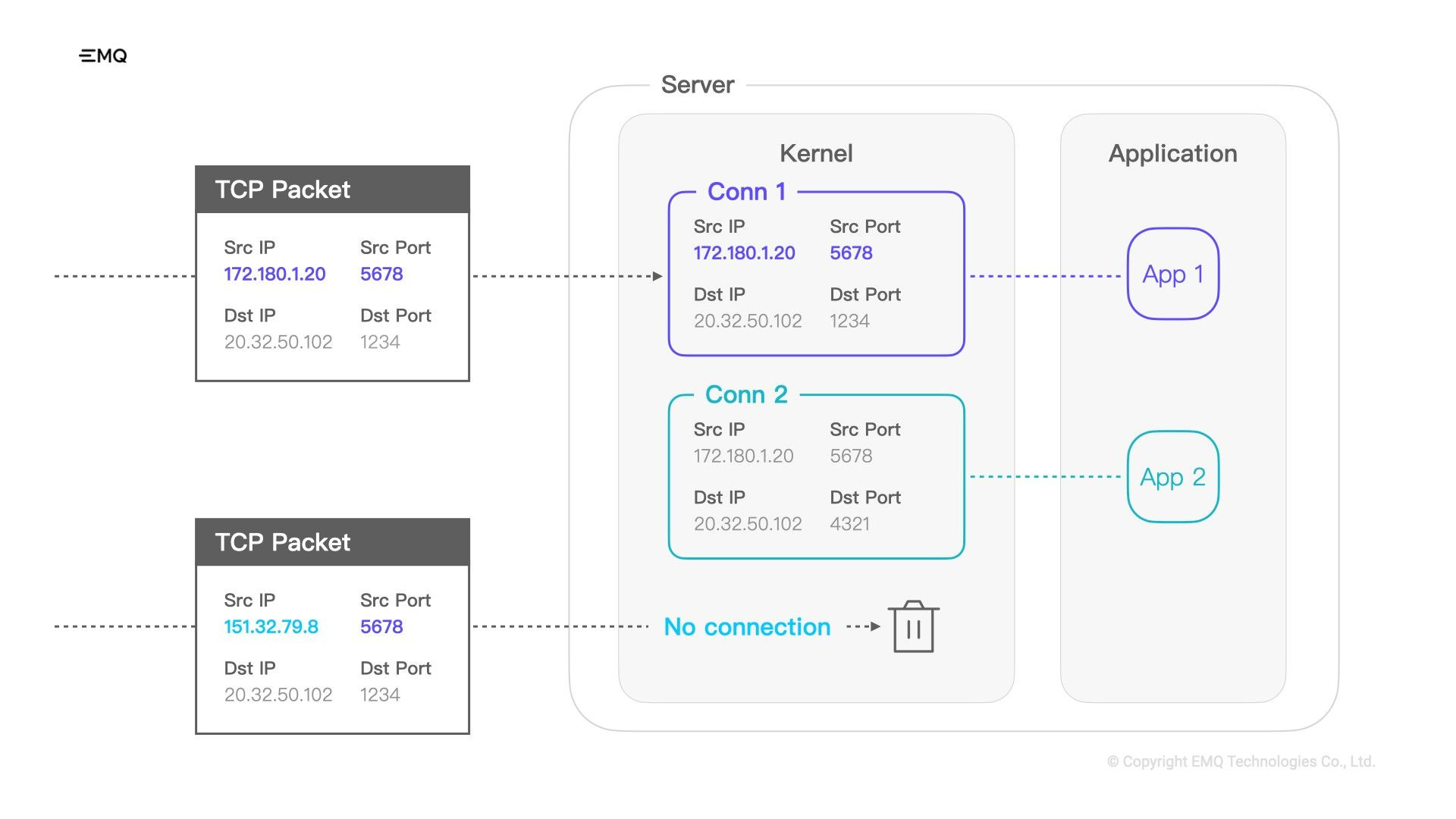 Once a connection is established, this four-tuple is determined and will remain constant through out the lifecycle of the connection. All packets sent by both parties will contain these four elements. So the receiver can decide which connection it should deliver to based on the values of these four elements in the packet. If any one of these four elements in the TCP packet changes, the receiver will consider that this packet belongs to another TCP connection.