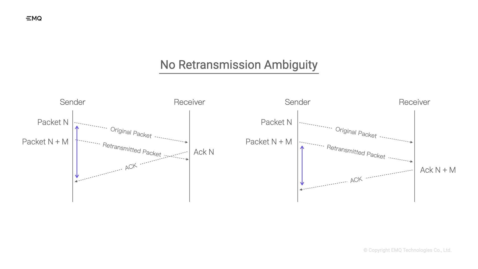 Moreover, QUIC revolutionizes the way congestion control algorithms calculate RTT by utilizing a strictly monotonically increasing Packet Number instead of packet timestamps. As mentioned, in TCP, a retransmitted packet retains the same sequence number, potentially leading to confusion in RTT calculation. However, with QUIC, a retransmitted packet receives a new Packet Number, ensuring accurate RTT calculation without the need for additional data in the packets.