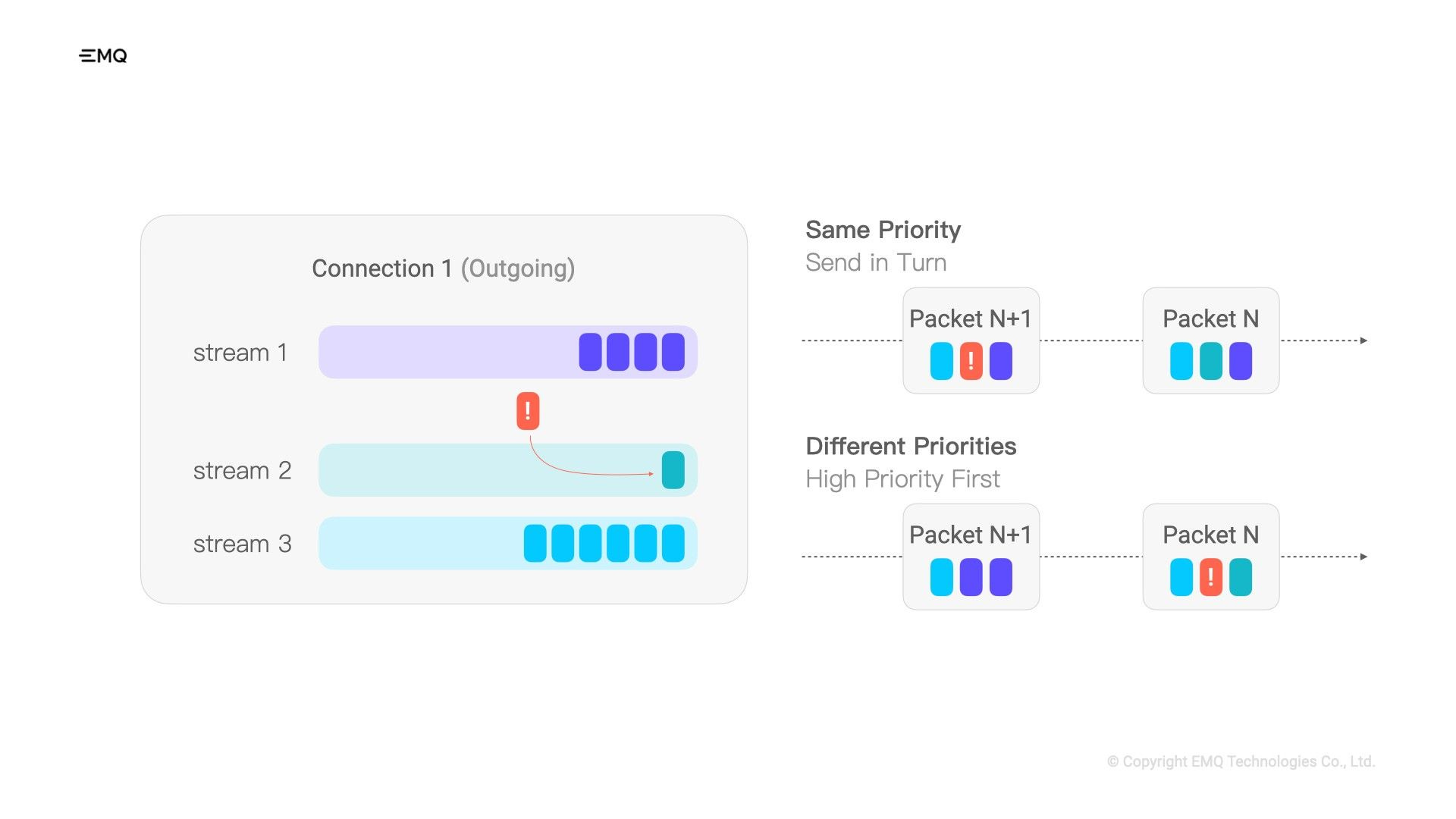 We can also set different priorities for streams if we want such urgent messages to be sent faster. QUIC will send data in high-priority streams as much as possible based on the priority of the stream and the current congestion situation.
