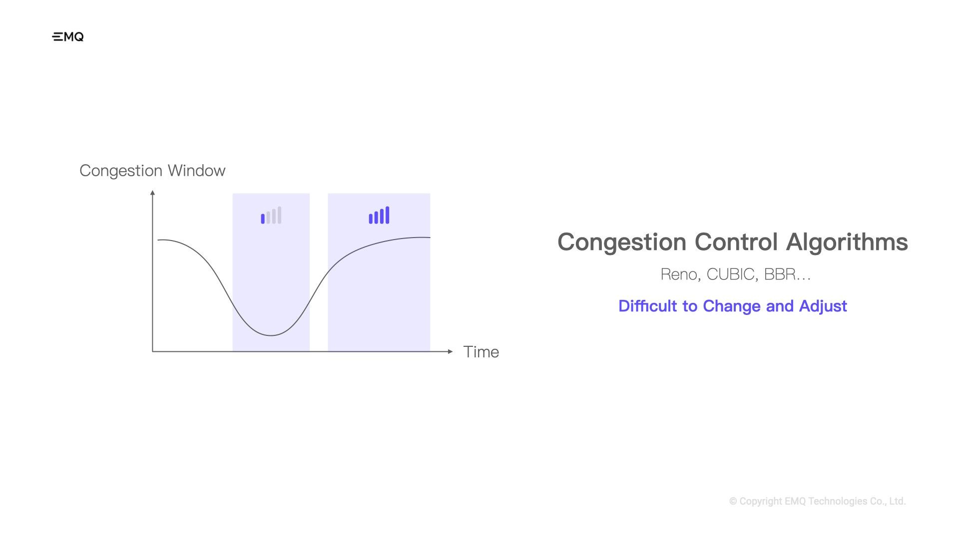 The next problem is TCP's hard-to-change congestion control algorithm. TCP needs to change the size of the congestion window according to the network conditions at any time, which determines the amount of data that the sender can send simultaneously. TCP needs to avoid making things worse when the network is already jammed up and make the most of the network's capacity when it's not too busy. All of this depends on the specific congestion control algorithm that TCP uses. Since TCP first came into the scene, there have been loads of different versions of the congestion control algorithms.