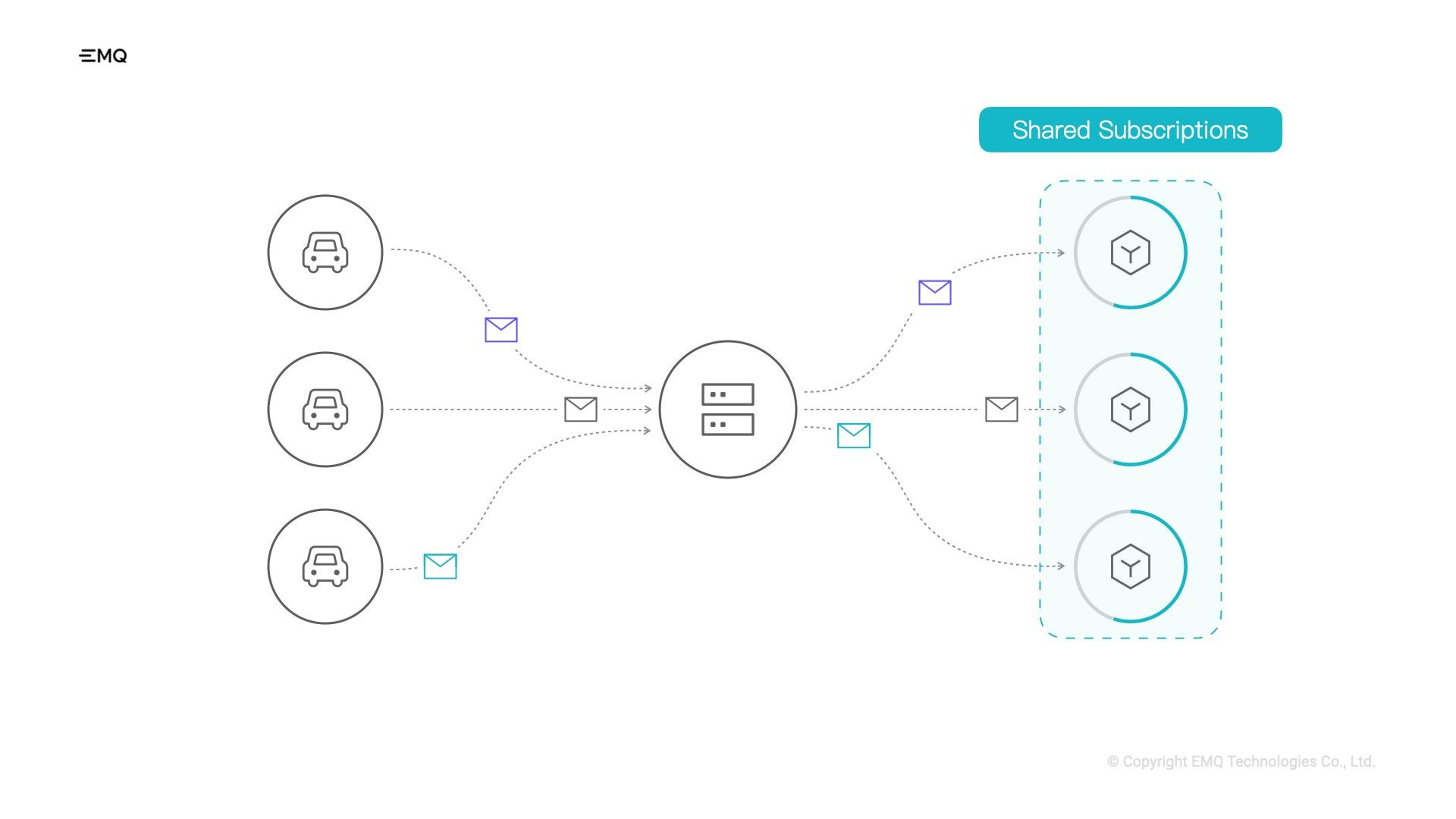 As MQTT spread, some challenges arose. For instance, in some scenarios where a large amount of data flowed through the MQTT broker, the processing capacity of the consumer became a bottleneck. To address this issue, EMQ implemented a shared subscription feature, allowing multiple clients to consume data in a load-balanced manner, MQTT 5.0 subsequently improved this feature and standardized it.