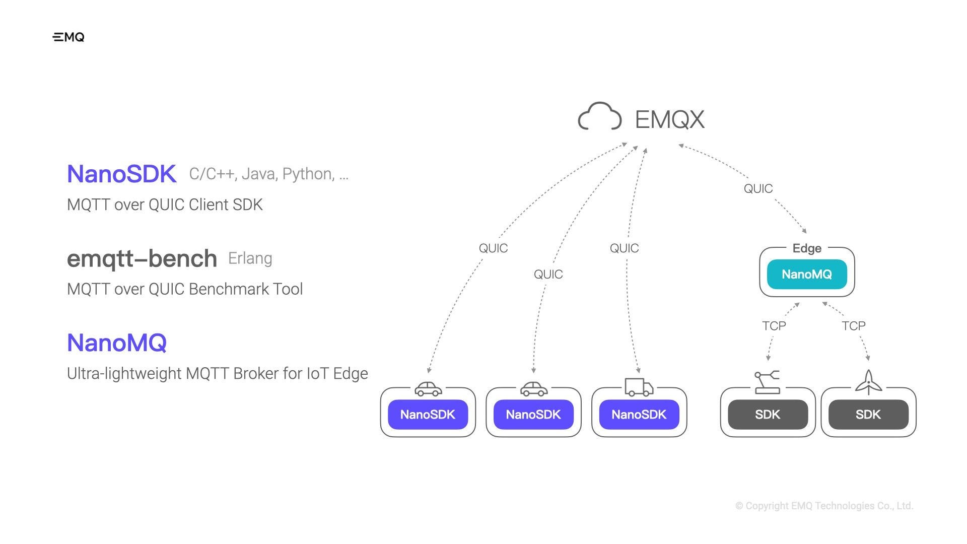 For those devices that cannot find a suitable MQTT over QUIC SDK or are difficult to modify the firmware, we provide an edge-side solution based on NanoMQ.