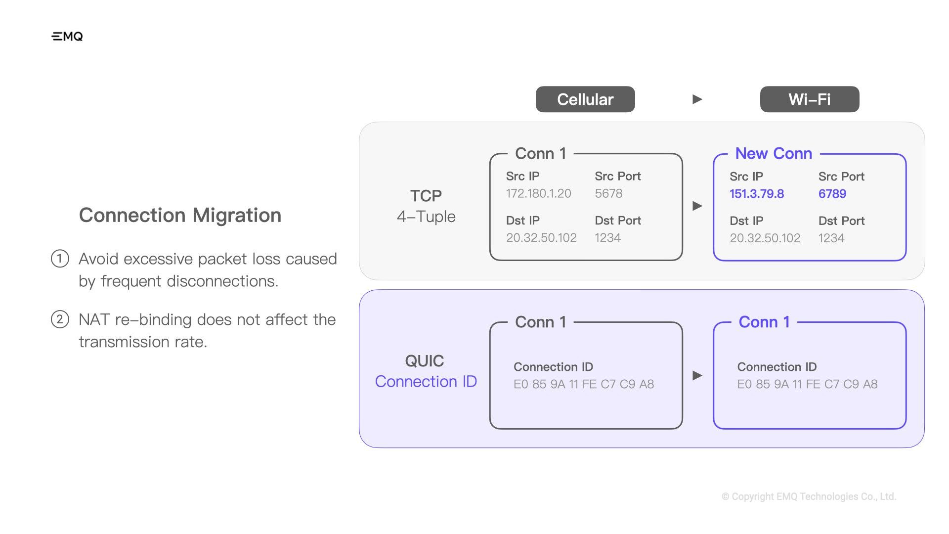Another advantage of QUIC is that it supports connection migration. The TCP’s four-tuple causes the connection to halt when the network switches, so QUIC has switched to using a randomly-generated 64-bit connection ID. This way, even if a network switch occurs and one party's IP and port change, QUIC can still deliver the message to the correct connection through the connection ID.