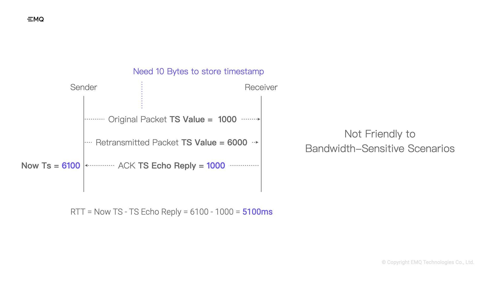 Nevertheless, while the timestamp feature resolves the RTT calculation issue, it comes with its own challenge. The inclusion of a timestamp in each TCP packet adds an extra 10 bytes of overhead, which could become a concern in bandwidth-sensitive scenarios.
