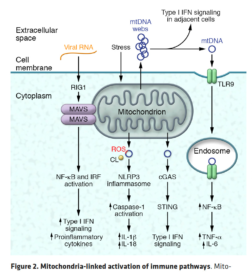 So let’s review the new paper’s finding with respect to this principal mitochondrial function of energy production. It turns out the virus binds directly to essential mitochondrial proteins, suppressing mitochondrial gene expression (both nuclear-encoded and mitochondria-encoded), inducing mitochondrial energy production dysfunction and activation of the immune response (innate immunity, spelled wrong, top right, in their Figure below).
