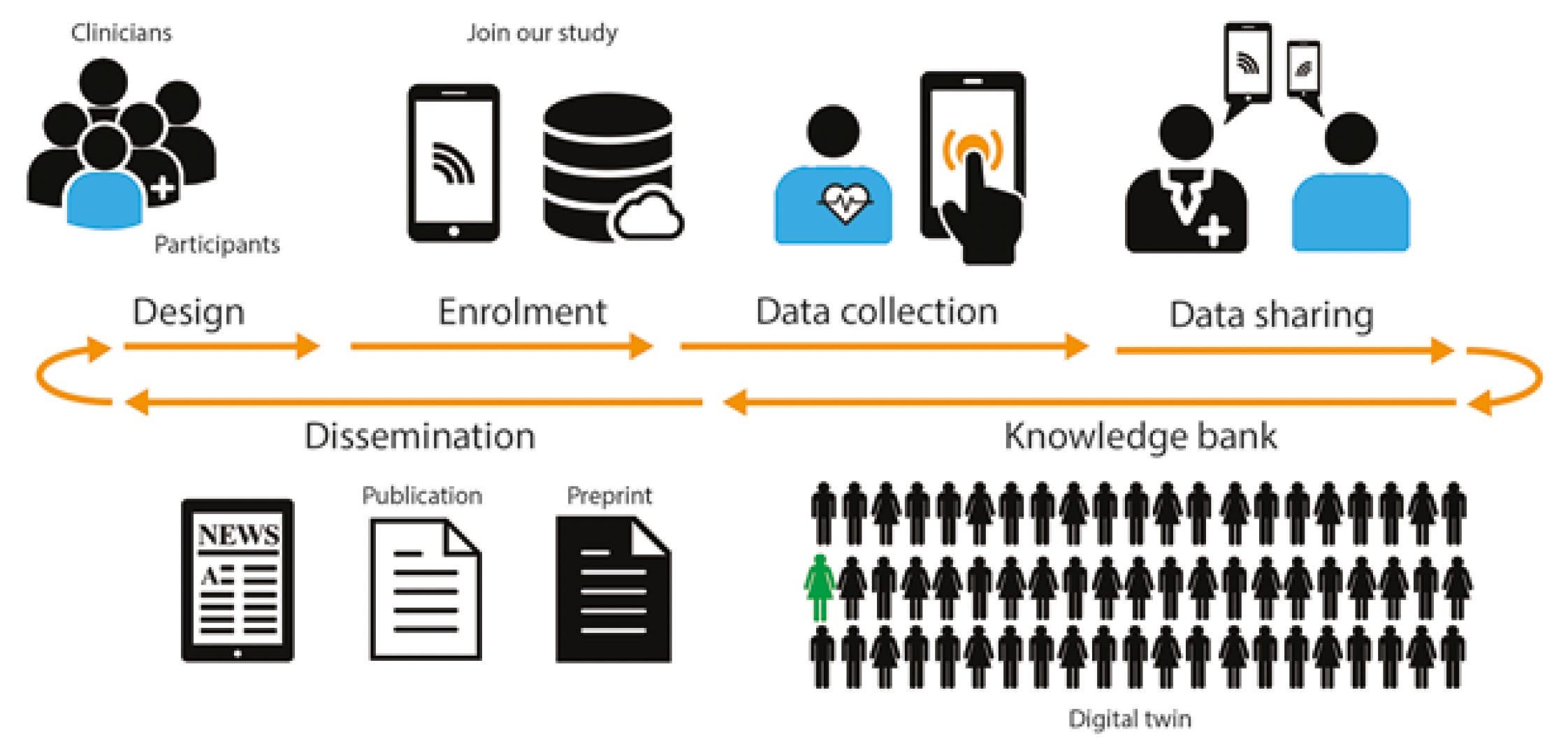 We can do this, but it’s not going to get done by traditional means of having people with Long Covid show up to clinics and go through extensive baseline evaluations and endless surveys about their symptoms (the RECOVER approach). So many of the folks affected with Long Covid can barely get out of bed, no less trek to a clinic appointment. As was done with the successful metformin randomized trial shown to prevent Long Covid (I reviewed here and here), participants were recruited digitally and sent the medication (be it active or placebo) via the mail. This is the concept of the direct-to-participant digitized clinical trial (Figure below), at scale, through smartphone apps and websites, that my colleagues (especially Steven Steinhubl) and I introduced several years ago.