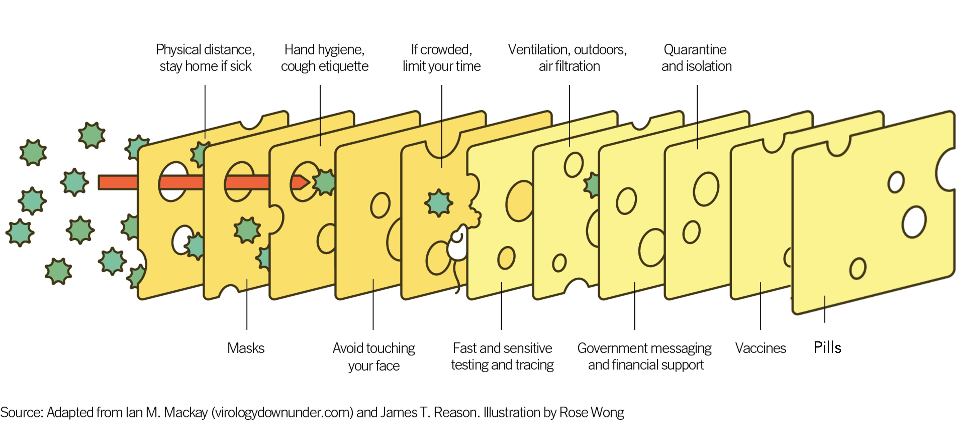 Adapting the Swiss cheese model from Professor Ian McKay, illustrated by Rose Wong, a new layer of protection is actualized by this pill on top of all the other layers that we have to work with. Not depicted in this model are rapid antigen tests, which goes along with their relative absence in the United States. Yet they will greatly facilitate the early use of paxlovid and it is essential their availability is scaled and cost greatly reduced (free would be the right cost to promote their frequent use).