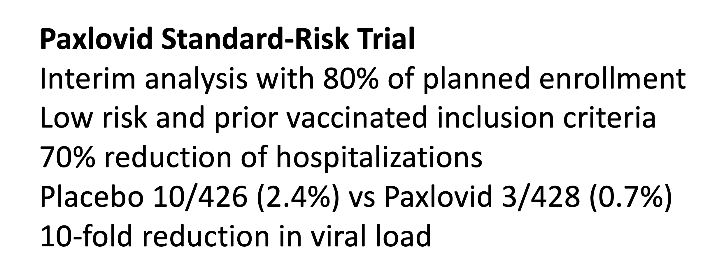 The second clinical trial was in standard (lower) risk patients, vaccinated or unvaccinated, and has not yet been completed. It clearly was a lower risk group with 2.4% events (hospitalizations) in the control group compared with 6.3% in the placebo group of the high-risk trial. The relative and absolute reduction in hospitalizations is lower, but quite consistent with the high-risk trial. By definition, this trial is woefully underpowered. With such a low event rate in the control arm, it would actually require a trial many time larger in sample size than the other one to have adequate statistical power.