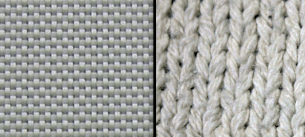 | Commonly found in: trousers, collared/button up shirts, bedsheets, dish towels, woven boxers, quilts, coats, etc. Not stretchy. Loose threads won’t make the whole cloth unravel. | Commonly found in: T-shirts, polo shirts, leggings, underwear, anything made of jersey fabric, sweaters, sweatpants, socks. Stretchy. If you pull on a lose thread, the cloth unravels. |