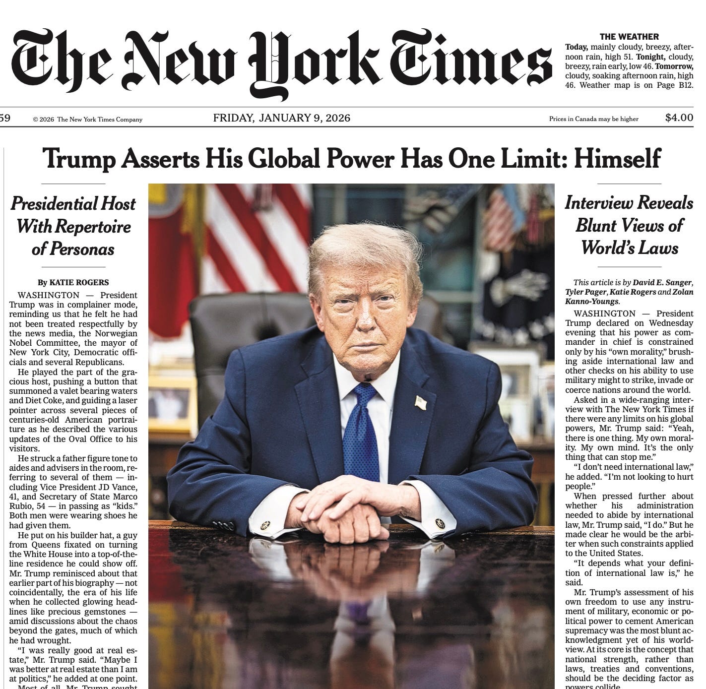 In this same week, we face the quickening onrush of other cruel and chaotic news. ICE’s escalating and lethal war against “blue state” America, whose focus has moved from California to Illinois to Oregon and now Minnesota. Meanwhile, Trump schmoozes in the Oval Office for hours with New York Times reporters, making “I’m the king of the world!” assertions like those shown on the NYT’s front page two days ago. Still a guy from Queens, with a chip on his shoulder, lapping up respect from the august Times.2 In this same week we’ve had Trump’s revived dream of taking control of Greenland—and perhaps Mexico too.