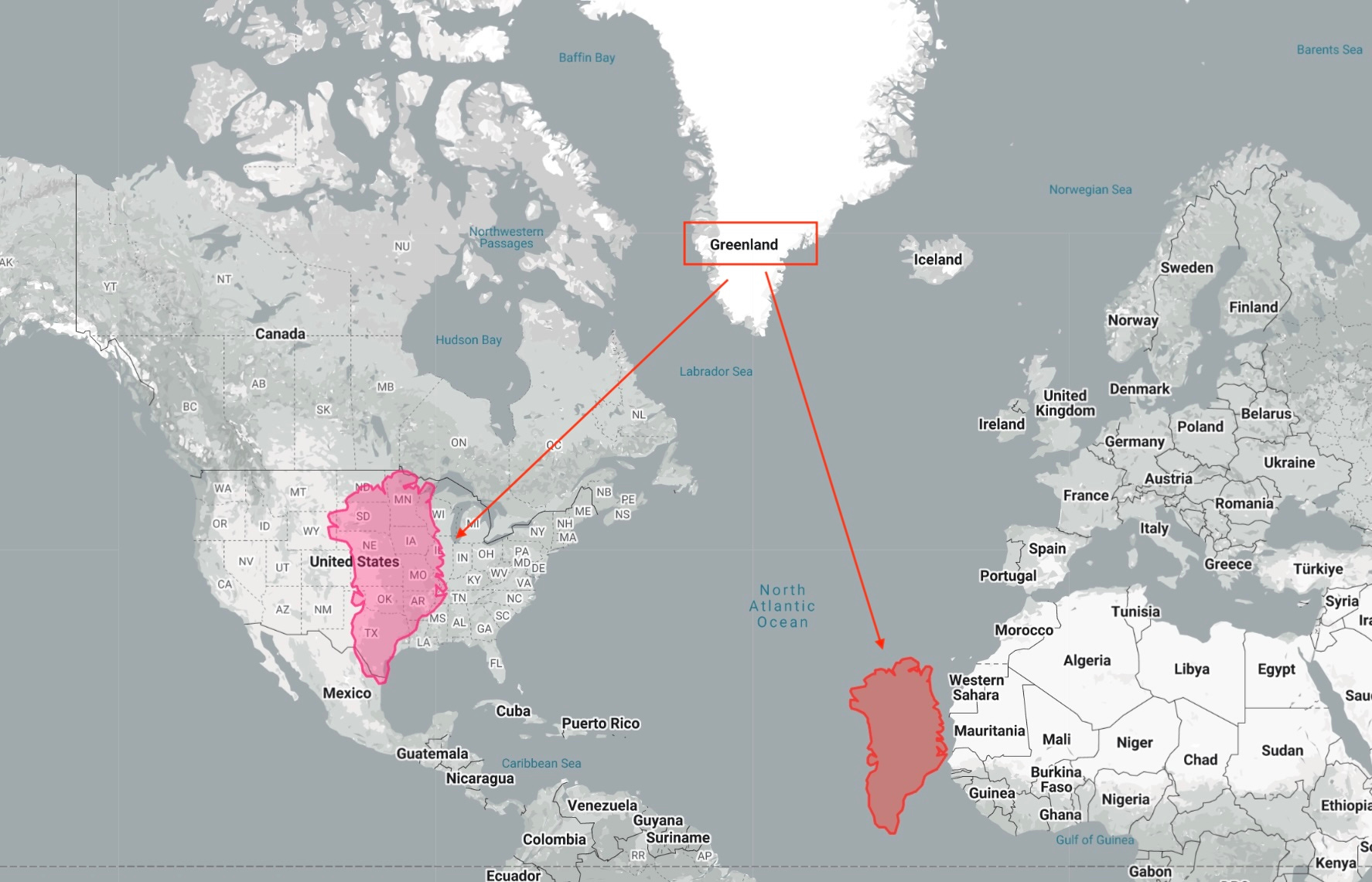 On traditional “Mercator Projection” maps like those Donald Trump would have grown up with, Greenland is the huge mass at top. That’s due to the distortions of representing a sphere on a flat plane. In reality, Greenland is about as big as the US between the Mississippi and the Rockies, as shown in the pink image, most it covered with mile-thick ice. It’s a little smaller than Algeria, as shown in red. (JF map via TheTrueSize.com.)