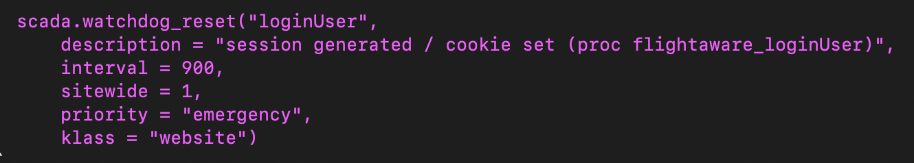 Another example: Our tens of thousands of ADS-B ground stations connect randomly to one of eighty backends that receive and process their data. Should one of those backends stop producing and we don’t detect it, only about 1.25% of the ground stations’ data will be lost, and since in most places there is a fair bit of overlap between ground stations, we’re unlikely to detect that by using software to look at airport pages or various geographies. Sure, we could look at the aggregate feed and notice one of the subfeeds is missing, but that’s kind of a watchdog timer by different means. Using our approach, each backend resets a watchdog timer whose watchdog ID includes the backend number. If any of them stop reporting success, we’ll get an alarm on each of the ones that have failed.