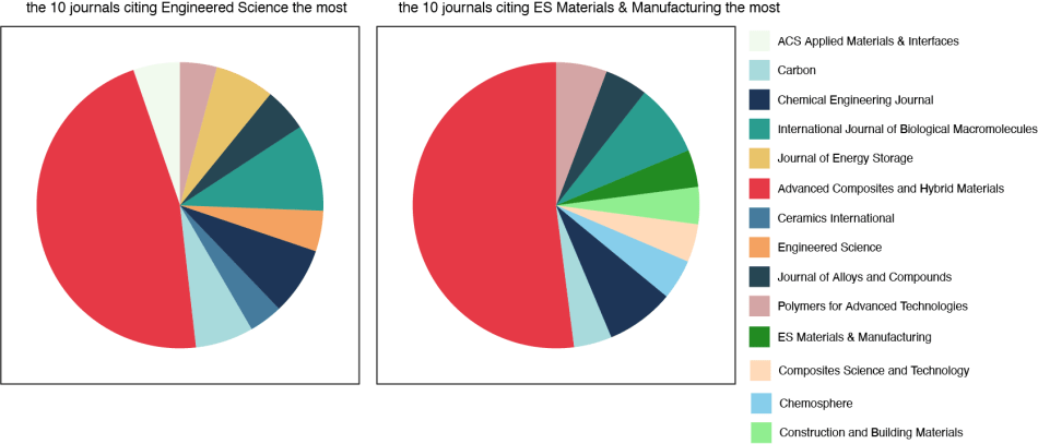 The two pie-charts below show the 10 journals that cite papers from Engineered Science (left) and ES Materials & Manufacturing (right) the most. ACHM is, by a huge margin, the most significant channel for citations to both.