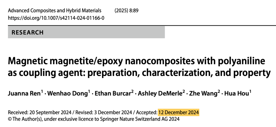 Juanna Ren, Wenhao Dong, Ethan Burcar, Ashley DeMerle, Zhe Wang, Hua Hou Magnetic magnetite/epoxy nanocomposites with polyaniline as coupling agent: preparation, characterization, and property Advanced Composites and Hybrid Materials (2024) doi: 10.1007/s42114-024-01166-0