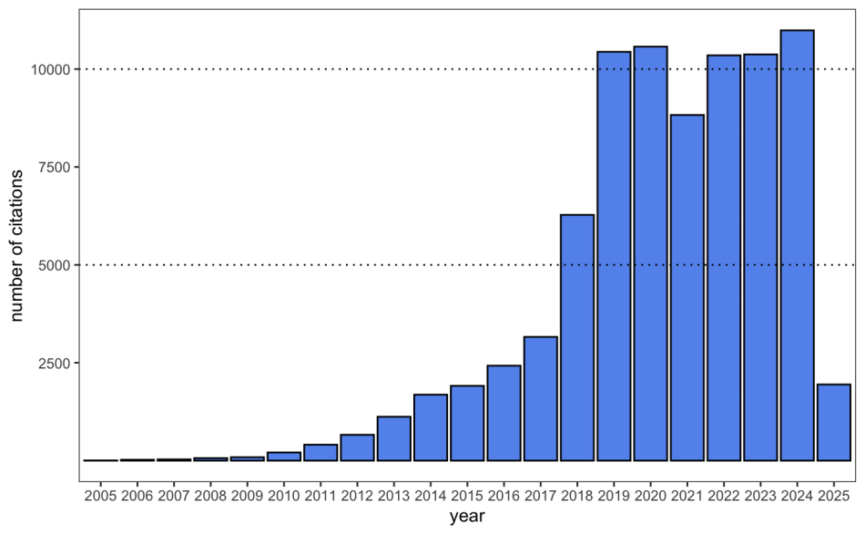 Guo cites himself a lot, like, A LOT. Over 150 papers he co-authored each cite 20 or more of his own papers. These papers with seemingly excessive self-citation coincide beautifully with his galactic ascent to glory and 10.000 citations a year between 2017 and 2020. If we visualize his papers with excessive self-citations over time, it looks a lot like a metaphorical middle-finger directed at the scientific community: