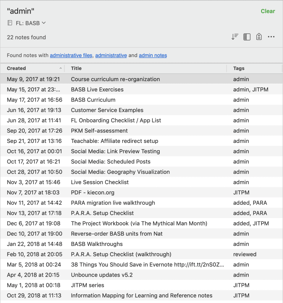 Here is an example of notes collected over the course of a year related to my online course Building a Second Brain. In the right-hand column you can see a few different kinds of tags that I use to segment this stream of notes into distinct types: