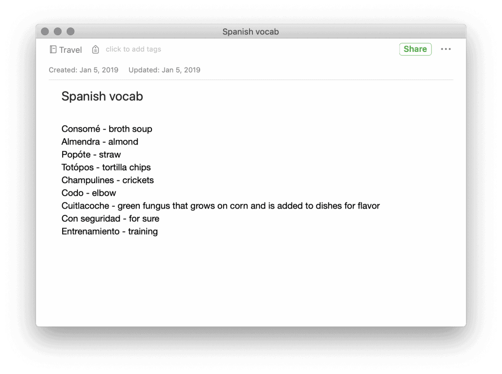 For example, if I become interested in learning Spanish for a vacation, I might save some useful Spanish words I learn to my “Travel” notebook. No structure is needed at this point, because everything I know about the topic is contained in one note.